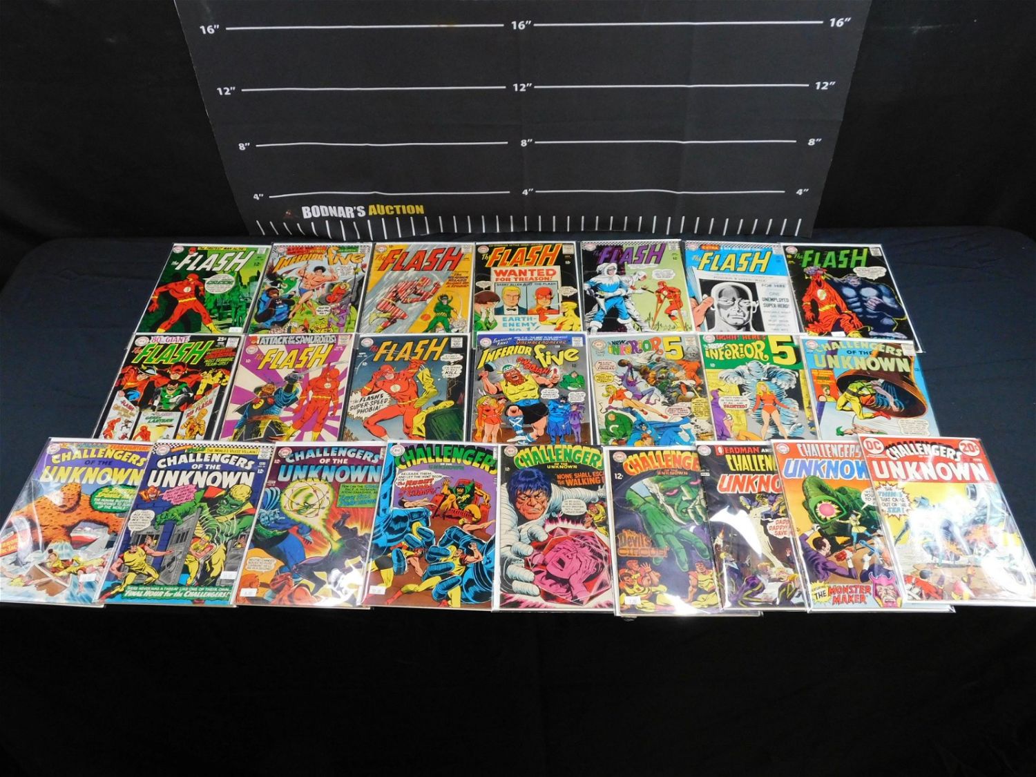 Lot of 23 Silver and Bronze Age DC Comics including The Flash #145, 156, 166, 167. 172, 178, 181, 182, and 188, The Inferior Five #3, 4, 8, and 9, and Challengers of the Unknown #46, 47, 50, 58, 61, 63, 65, 74 76, and 80. Please read the terms and conditions. This sale will be broadcast live on sale day with full descriptions of each lot being sold. All items MUST be paid for within 24 HOURS of the sale. Anyone who has not paid within 24 hours will have a dispute opened against them and will not be able to bid at future sales. If you need your items shipped, we will send your items to the UPS store in Monmouth Junction, NJ . They will pack it and ship it to you and you will pay them separately and directly. Please call them to get a quote before bidding. Their phone number is 732-230-3551. If you are picking your items up you must contact us NO LATER than 24 hours after the sale to schedule an appointment to pick up. Pick up dates are Thursday, Friday, Saturday, and Monday ONLY, and are BY APPOINTMENT ONLY!! After Monday, if you have not picked up your items, they will be disposed of.