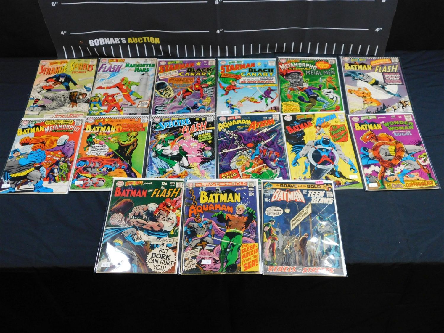 Lot of 15 Silver Age Brave and The Bold Comics including Issues #49, 56, 61, 62, 66-69, 72, 73, 77, 78, 81, 82, and 94. Please read the terms and conditions. This sale will be broadcast live on sale day with full descriptions of each lot being sold. All items MUST be paid for within 24 HOURS of the sale. Anyone who has not paid within 24 hours will have a dispute opened against them and will not be able to bid at future sales. If you need your items shipped, we will send your items to the UPS store in Monmouth Junction, NJ . They will pack it and ship it to you and you will pay them separately and directly. Please call them to get a quote before bidding. Their phone number is 732-230-3551. If you are picking your items up you must contact us NO LATER than 24 hours after the sale to schedule an appointment to pick up. Pick up dates are Thursday, Friday, Saturday, and Monday ONLY, and are BY APPOINTMENT ONLY!! After Monday, if you have not picked up your items, they will be disposed of.