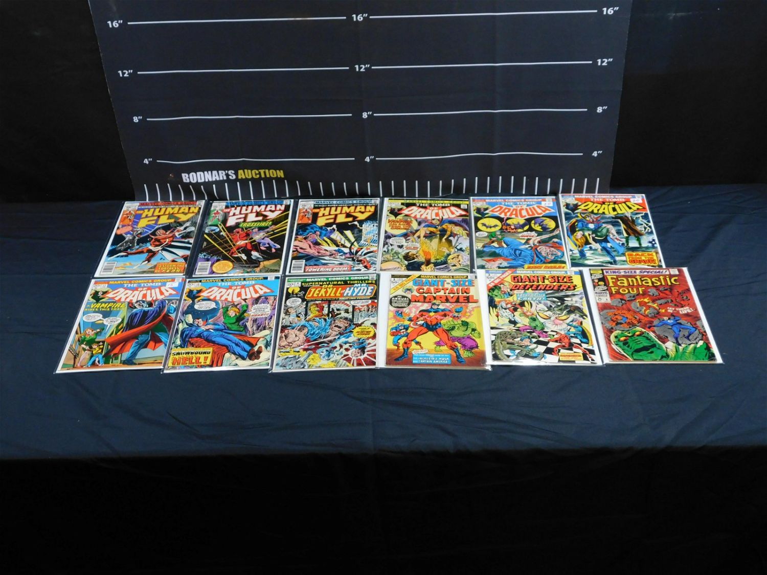 Lot of 12 Bronze Age Marvel Comics including Tomb of Dracula #14-17 and 19, Supernatural Thrillers #1, Giant Size Captain Marvel #1, Human Fly #3-5, Giant Size Defenders #3, and Fantastic Four King Size #6. Tomb of Dracula #16 – Dr. Sun Cameo, #17 – Blade is bitten by Dracula, #19 – Blade discovers he is a person. Please read the terms and conditions. This sale will be broadcast live on sale day with full descriptions of each lot being sold. All items MUST be paid for within 24 HOURS of the sale. Anyone who has not paid within 24 hours will have a dispute opened against them and will not be able to bid at future sales. If you need your items shipped, we will send your items to the UPS store in Monmouth Junction, NJ . They will pack it and ship it to you and you will pay them separately and directly. Please call them to get a quote before bidding. Their phone number is 732-230-3551. If you are picking your items up you must contact us NO LATER than 24 hours after the sale to schedule an appointment to pick up. Pick up dates are Thursday, Friday, Saturday, and Monday ONLY, and are BY APPOINTMENT ONLY!! After Monday, if you have not picked up your items, they will be disposed of.