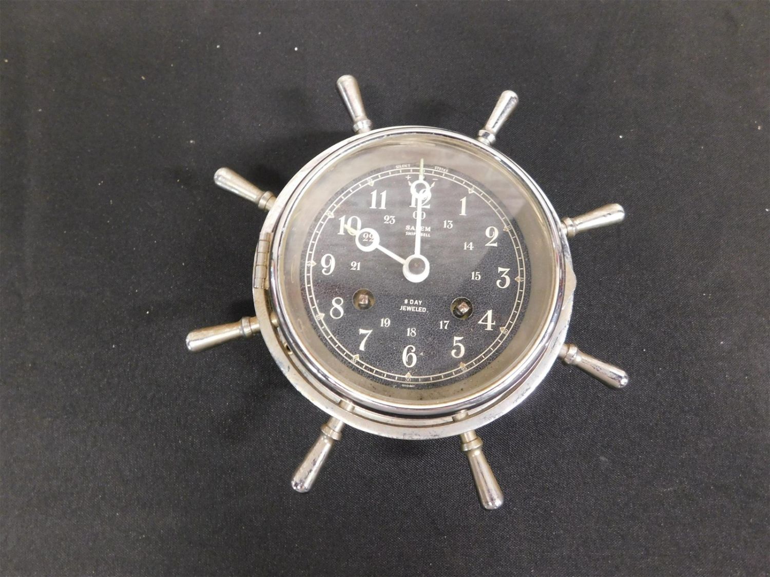 Salem ship’s clock with ship’s wheel decoration marked Salam ships bell 8-day jeweled, untested. Measures 7 inches in diameter. All invoices must be paid within 24 hours of the sale. This auction is Local Pick Up, Shipping with Liveauctioneers Live Ship or with the Local UPS Store in Monmouth Junction, NJ. Local pickups are at our Monmouth Junction location on Thursday, Friday, Saturday and Monday ONLY! All pickups are by appointment only. Any condition issues will be listed in the description. Please read the terms for full information.