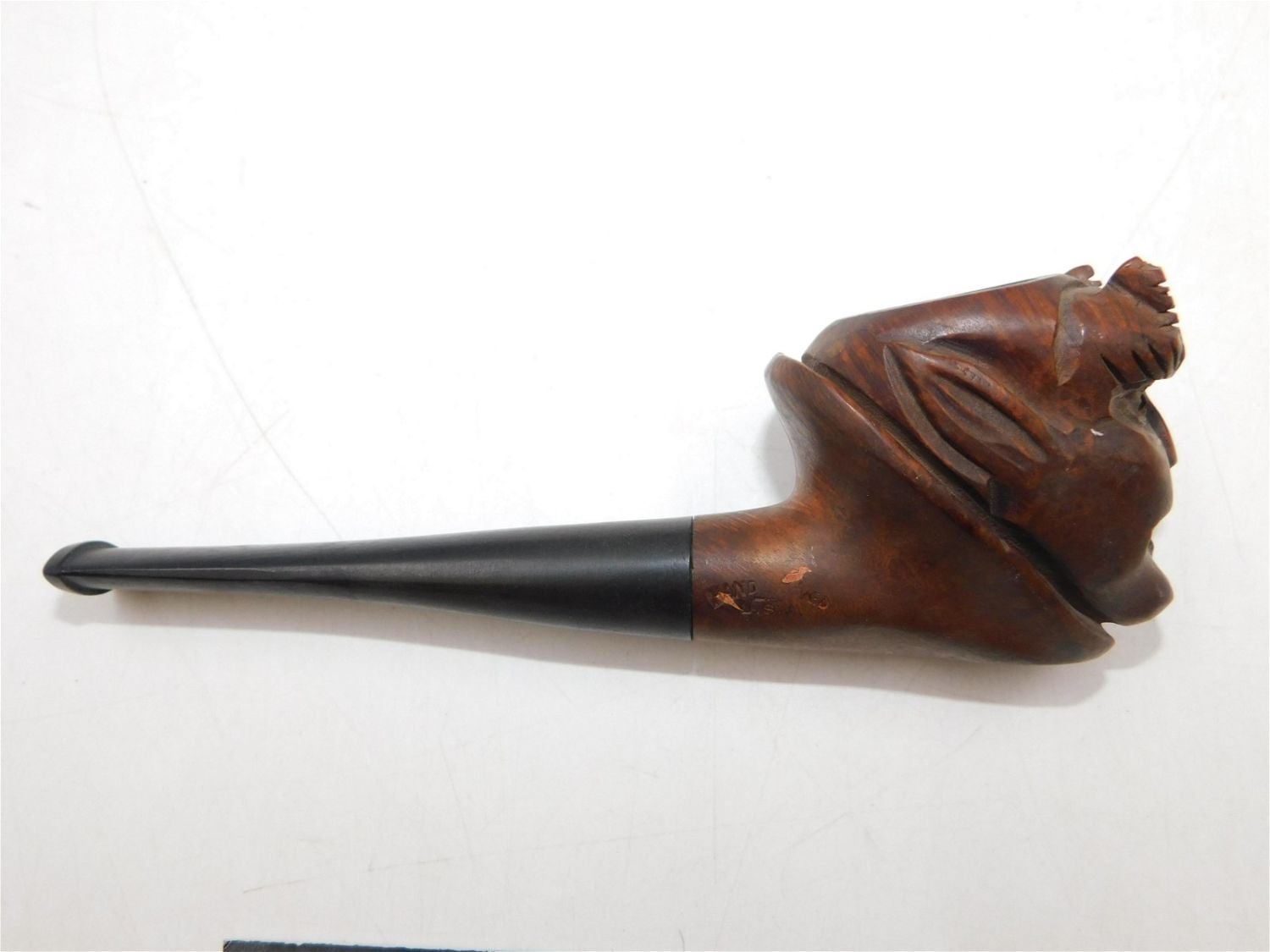 Marxman Imported Briar Hand Carved USA Devil Pipe. Measures 5.5" long. All invoices must be paid within 24 hours of the sale. This auction is Local Pick Up, Shipping with Liveauctioneers Live Ship or with the Local UPS Store in Monmouth Junction, NJ. Local pickups are at our Monmouth Junction location on Friday, Saturday and Monday ONLY! All pickups are by appointment only. Any condition issues will be listed in the description. Please read the terms for full information.