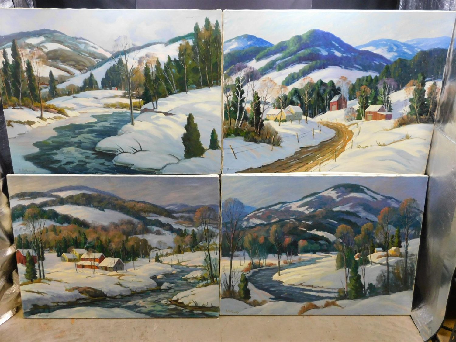 Lot of 4 Oil on Canvas by George Holloway depicting Winter Scenes. Measures 30" tall x 40" wide. George Holloway is a Local Award Winning NJ Artist that has been sold in Galleries. Measures All invoices must be paid within 24 hours of the sale. THIS IS A LOCAL PICKUP ONLY AUCTION IN MONMOUTH JUNCTION NJ. Local pickups are at our Monmouth Junction location on Thursday, Friday, Saturday and Monday ONLY! All pickups are by appointment only. Any condition issues will be listed in the description. Please read the terms for full information.
