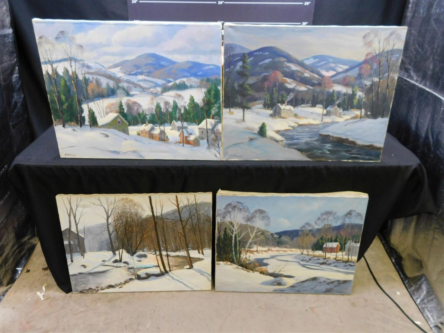 Lot of 4 Oil on Canvas by George Holloway depicting Winter Scenes. Measures 22" tall x 28" wide. George Holloway is a Local Award Winning NJ Artist that has been sold in Galleries. All invoices must be paid within 24 hours of the sale. THIS IS A LOCAL PICKUP ONLY AUCTION IN MONMOUTH JUNCTION NJ. Local pickups are at our Monmouth Junction location on Thursday, Friday, Saturday and Monday ONLY! All pickups are by appointment only. Any condition issues will be listed in the description. Please read the terms for full information.
