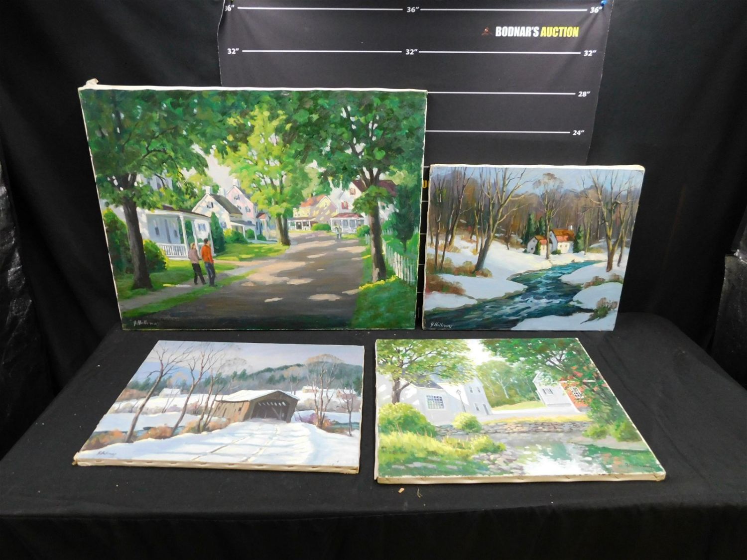 Lot of 4 Oil on Canvas by George Holloway depicting Winter and Summer Scenes. Three Sizes. Largest Measures 28" tall x 36" wide. George Holloway is a Local Award Winning NJ Artist that has been sold in Galleries. All invoices must be paid within 24 hours of the sale. THIS IS A LOCAL PICKUP ONLY AUCTION IN MONMOUTH JUNCTION NJ. Local pickups are at our Monmouth Junction location on Thursday, Friday, Saturday and Monday ONLY! All pickups are by appointment only. Any condition issues will be listed in the description. Please read the terms for full information.
