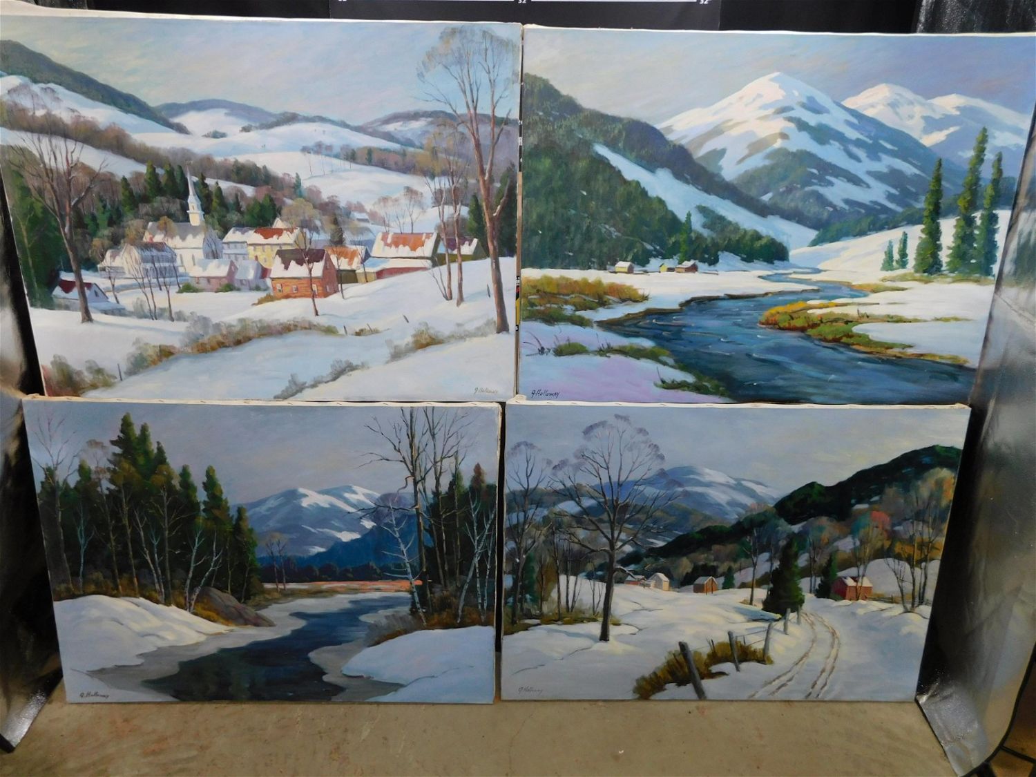 Lot of 4 Oil on Canvas by George Holloway depicting Winter Scenes. Measures 30" tall x 40" wide. George Holloway is a Local Award Winning NJ Artist that has been sold in Galleries. Measures All invoices must be paid within 24 hours of the sale. THIS IS A LOCAL PICKUP ONLY AUCTION IN MONMOUTH JUNCTION NJ. Local pickups are at our Monmouth Junction location on Thursday, Friday, Saturday and Monday ONLY! All pickups are by appointment only. Any condition issues will be listed in the description. Please read the terms for full information.