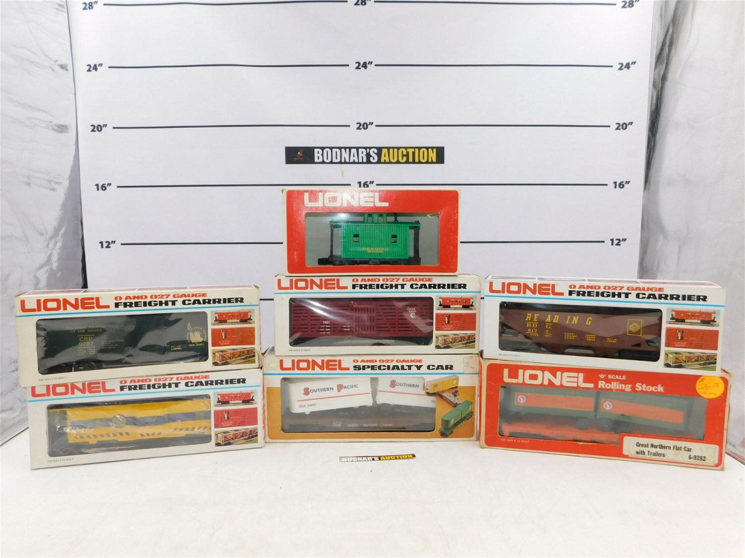 Lot of 7 Lionel O Gauge Rolling Stock including Reading Caboose #9068, Great Northern Flatcar w/Trailers #9282, SP Flatcar with Trailers #9333, Virginian Caboose #6401, CNJ Box Car #9787, CNO Stock Car #7401, and Reading Hopper #6177. All in original box. All invoices must be paid within 24 hours of the sale. No trains have been tested to be working. All lots ship Liveauctioneers Live Ship, to get a quote see the truck icon on this listing. You can Opt out of Live Shipping and use the Local UPS Store or arrange your own shipping . Local pickups are at our Monmouth Junction location on Friday, Saturday and Monday ONLY! All pickups are by appointment only. Any condition issues will be listed in the description. Please read the terms for full information.