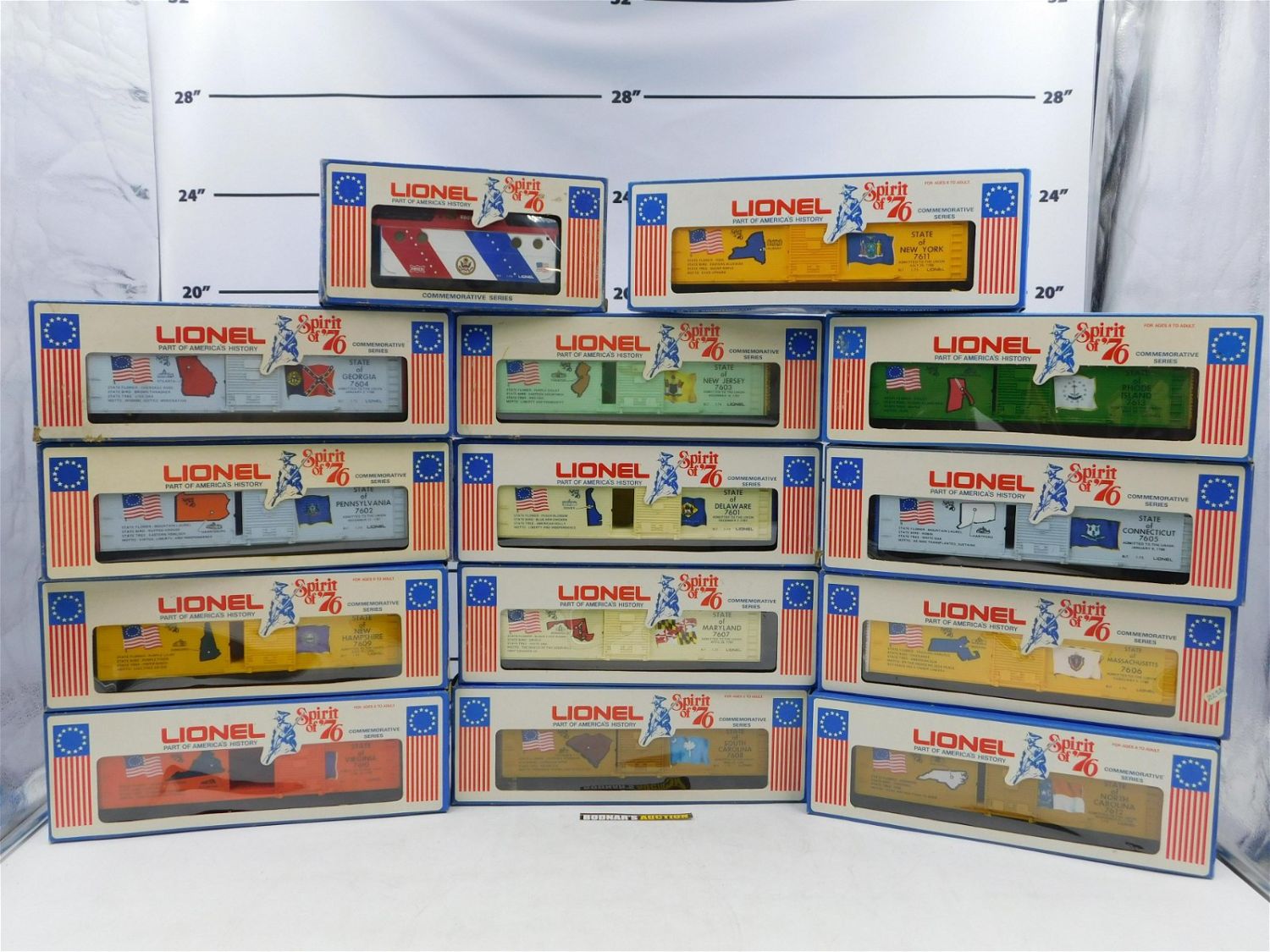 Lot of 14 Spirit of 76 Lionel Rolling Stock Box Cars. Including New York, Rhode Island, Caboose, and More. All come in original boxes. All invoices must be paid within 24 hours of the sale. No trains have been tested to be working. All lots ship Liveauctioneers Live Ship, to get a quote see the truck icon on this listing. You can Opt out of Live Shipping and use the Local UPS Store or arrange your own shipping . Local pickups are at our Monmouth Junction location on Friday, Saturday and Monday ONLY! All pickups are by appointment only. Any condition issues will be listed in the description. Please read the terms for full information.