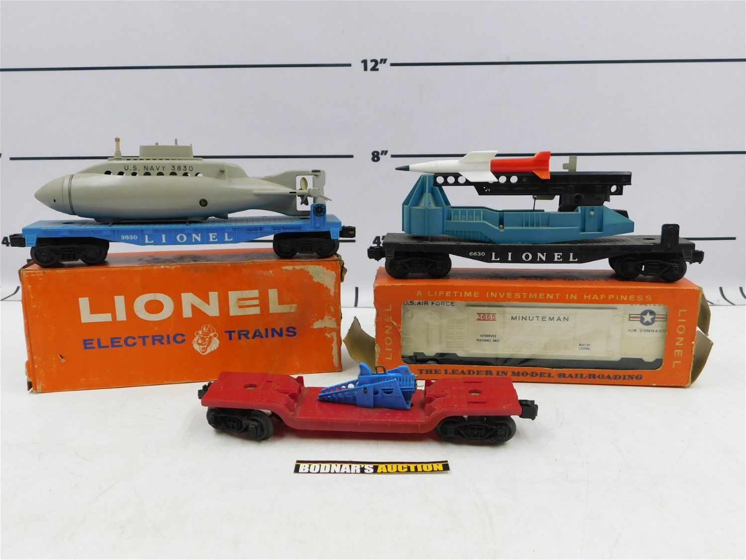 Lot of 4 Lionel Military Rail Cars including Flatcar with Operating Submarine #3830 with Box – Water damage on box, Missile Launching Car #6630 – No Box, Stratcom US Air Force Minuteman Box Car #3665 with Box (Major Damage to box and missing flaps) and Turbo Missile Launcher Complete with Missiles #3309 – No Box. All invoices must be paid within 24 hours of the sale. No trains have been tested to be working. All lots ship Liveauctioneers Live Ship, to get a quote see the truck icon on this listing. You can Opt out of Live Shipping and use the Local UPS Store or arrange your own shipping . Local pickups are at our Monmouth Junction location on Friday, Saturday and Monday ONLY! All pickups are by appointment only. Any condition issues will be listed in the description. Please read the terms for full information.