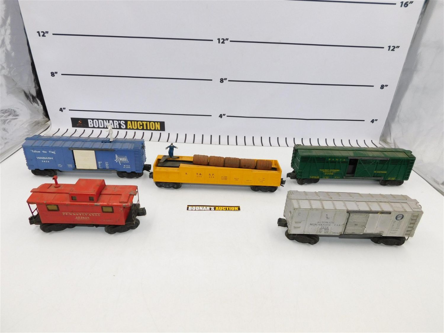 Lot of 5 O Gauge Lionel Rolling Stock including Automatic Merchandise Car #X3454, PRR Caboose #2457, Operating Barrel Car #356250, Wabash Operating Box Car #3424, and Santa Fe Operating Cattle Car #3356. Cars have some scratching to paint. All invoices must be paid within 24 hours of the sale. No trains have been tested to be working. All lots ship Liveauctioneers Live Ship, to get a quote see the truck icon on this listing. You can Opt out of Live Shipping and use the Local UPS Store or arrange your own shipping . Local pickups are at our Monmouth Junction location on Friday, Saturday and Monday ONLY! All pickups are by appointment only. Any condition issues will be listed in the description. Please read the terms for full information.