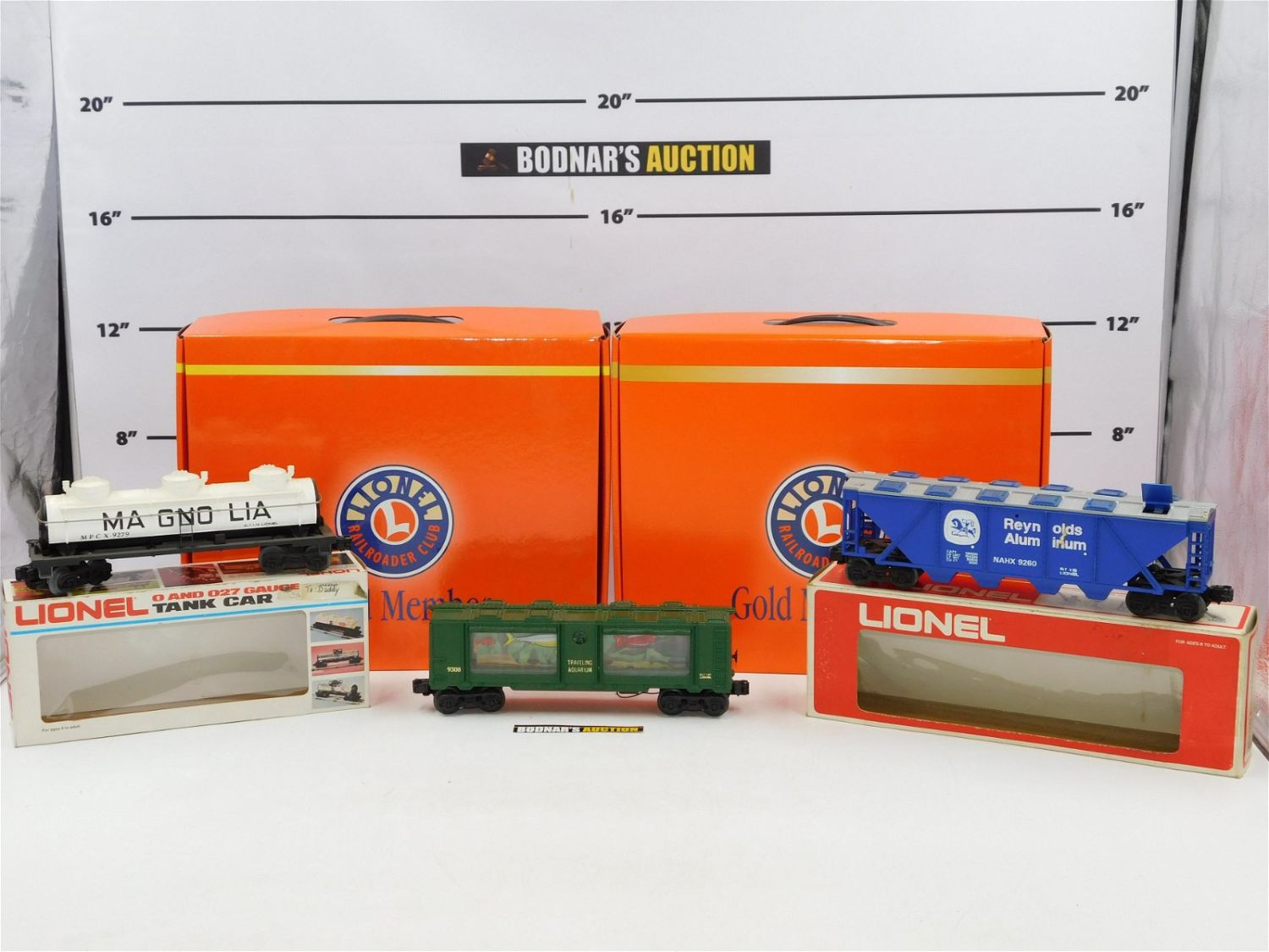 Lot of 5 O Gauge Lionel Rolling Stock including (2) RR Club Gold Member Boxes with Memorabilia, Pin, and Box Car in original box, Magnolia Tank Car #9279, Reynolds Billboard Hopper #9260, and Aquarium Car #9308 – Not in original box. All invoices must be paid within 24 hours of the sale. No trains have been tested to be working. All lots ship Liveauctioneers Live Ship, to get a quote see the truck icon on this listing. You can Opt out of Live Shipping and use the Local UPS Store or arrange your own shipping . Local pickups are at our Monmouth Junction location on Friday, Saturday and Monday ONLY! All pickups are by appointment only. Any condition issues will be listed in the description. Please read the terms for full information.