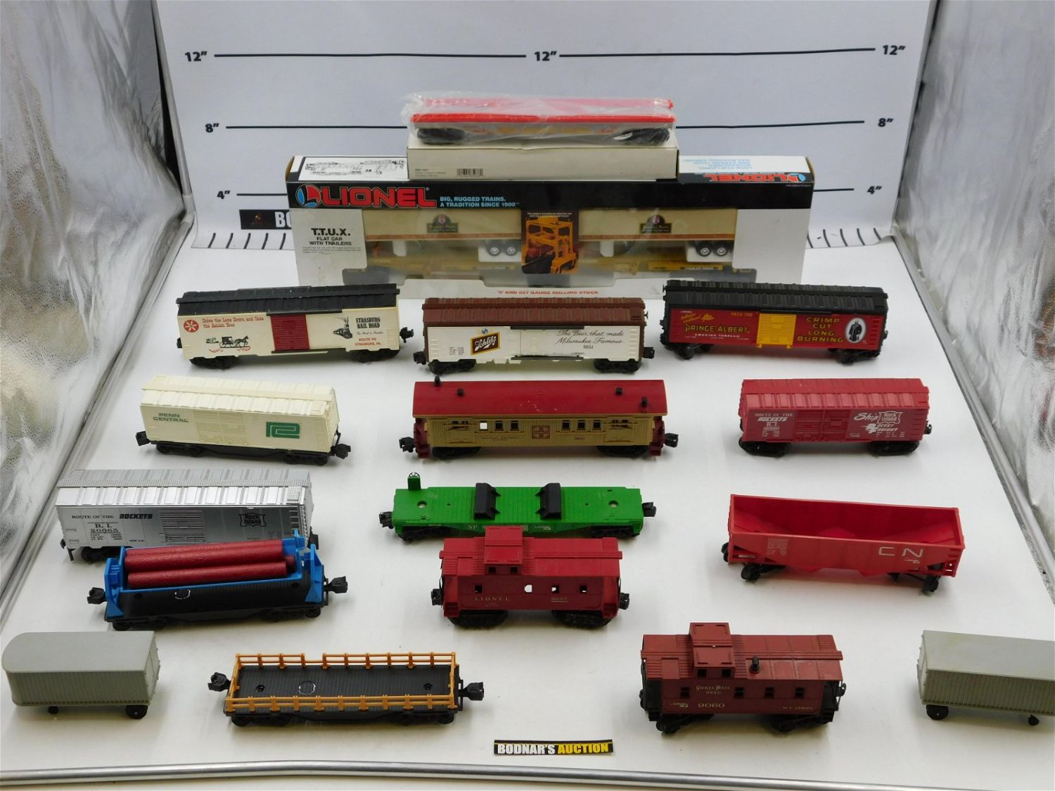 Large Lot of O Scale Rolling Stock including Lionel SP Flatcar with Trailers 16345 in Original Box, K-Line Circus Flat Car, Prince Albert Boxcar, Santa Fe Passenger Car, Rock Island Boxcar, Lionel Nickle Plate Road Caboose, Penn Central Boxcar, Lionel Rock Island Boxcar, Lionel Schlitz Boxcar, Stroudsburg RR Boxcar, Lionel CN Hopper, Lionel Caboose 6257, Lionel Log Loader Car, Lionel Flatcar w/Trailers 9120, and Lionel Flatcar. All invoices must be paid within 24 hours of the sale. No trains have been tested to be working. All lots ship Liveauctioneers Live Ship, to get a quote see the truck icon on this listing. You can Opt out of Live Shipping and use the Local UPS Store or arrange your own shipping . Local pickups are at our Monmouth Junction location on Friday, Saturday and Monday ONLY! All pickups are by appointment only. Any condition issues will be listed in the description. Please read the terms for full information.