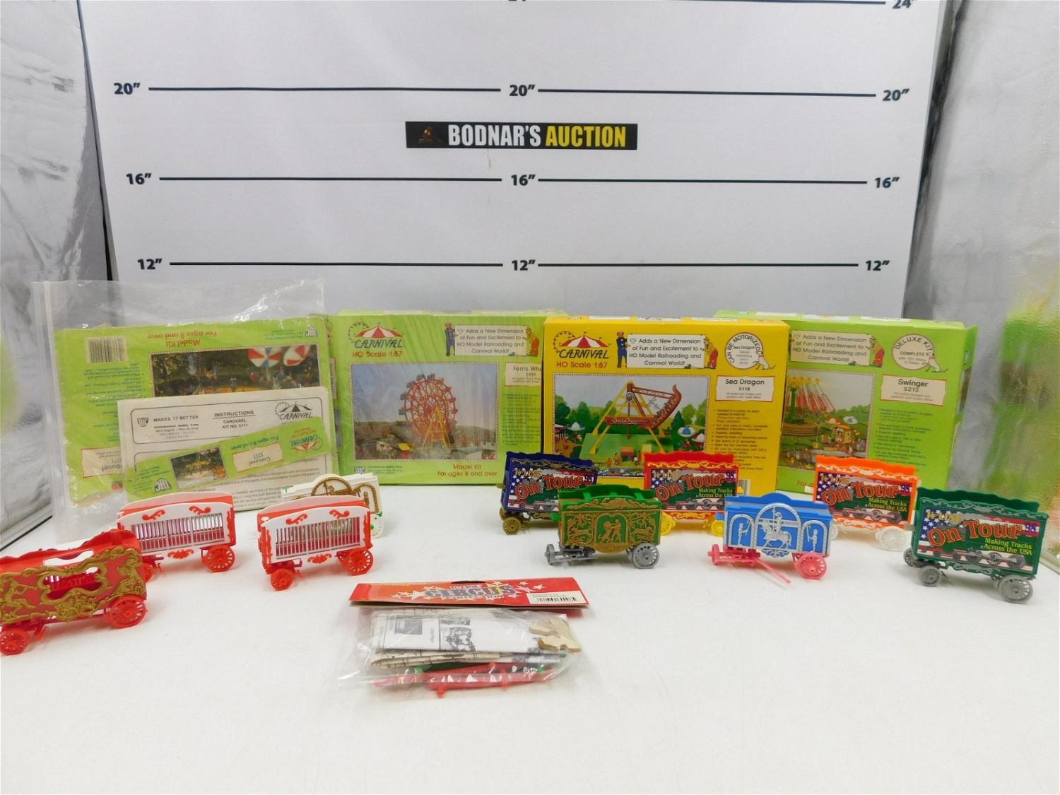 Lot of Train Accessories including Carnival HO Scale Model Kits and 10 Circus Wagons by K-Line. 3 Model Kits come in original boxes. Model Kits look to be incomplete. All invoices must be paid within 24 hours of the sale. No trains have been tested to be working. All lots ship Liveauctioneers Live Ship, to get a quote see the truck icon on this listing. You can Opt out of Live Shipping and use the Local UPS Store or arrange your own shipping . Local pickups are at our Monmouth Junction location on Friday, Saturday and Monday ONLY! All pickups are by appointment only. Any condition issues will be listed in the description. Please read the terms for full information.