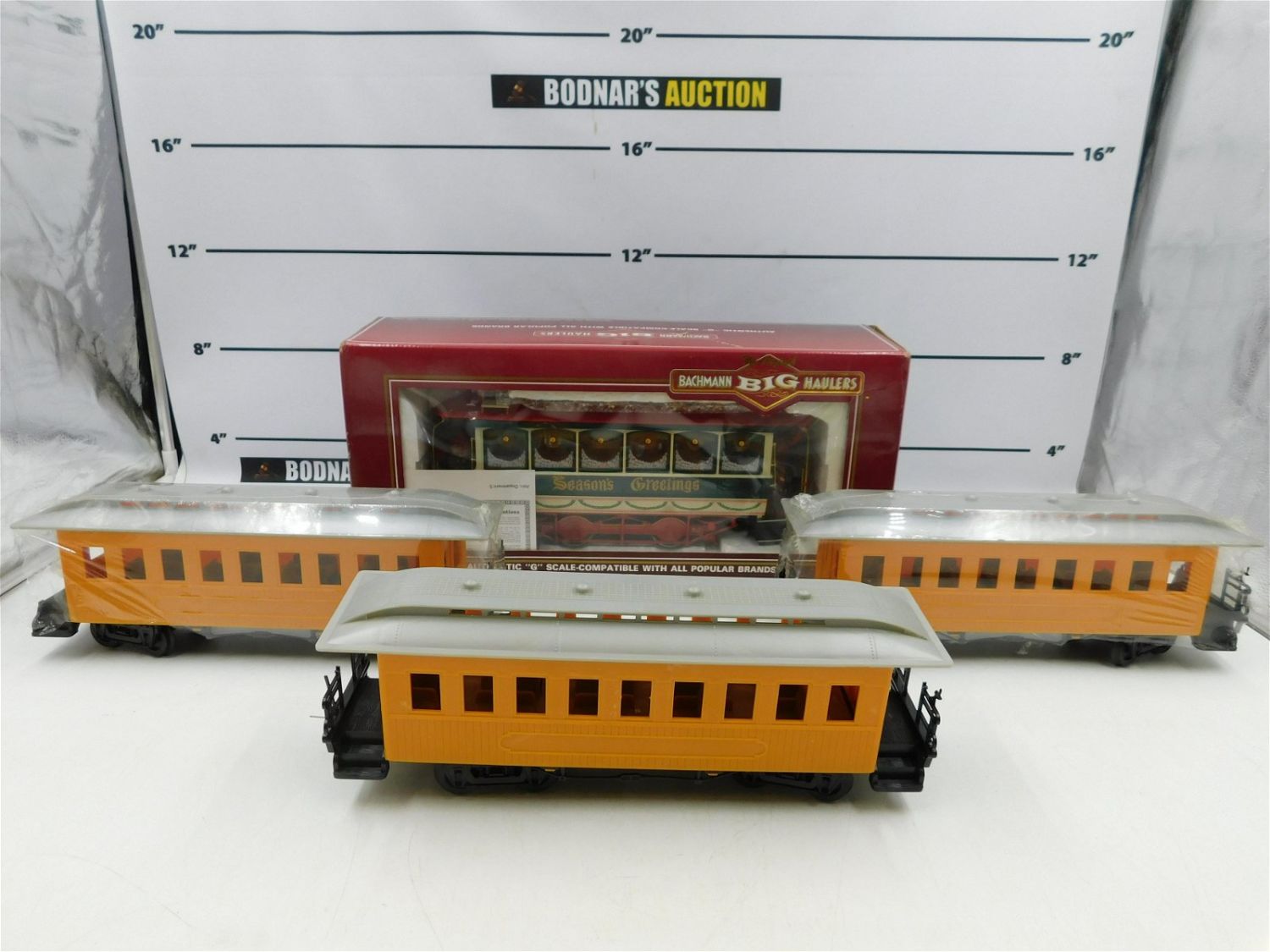 Lot of 4 G Scale Trains including Bachmann Christmas Street Car in original box with wear, and (3) Passenger Cars. Passenger cars have wear. All invoices must be paid within 24 hours of the sale. No trains have been tested to be working. All lots ship Liveauctioneers Live Ship, to get a quote see the truck icon on this listing. You can Opt out of Live Shipping and use the Local UPS Store or arrange your own shipping . Local pickups are at our Monmouth Junction location on Friday, Saturday and Monday ONLY! All pickups are by appointment only. Any condition issues will be listed in the description. Please read the terms for full information.