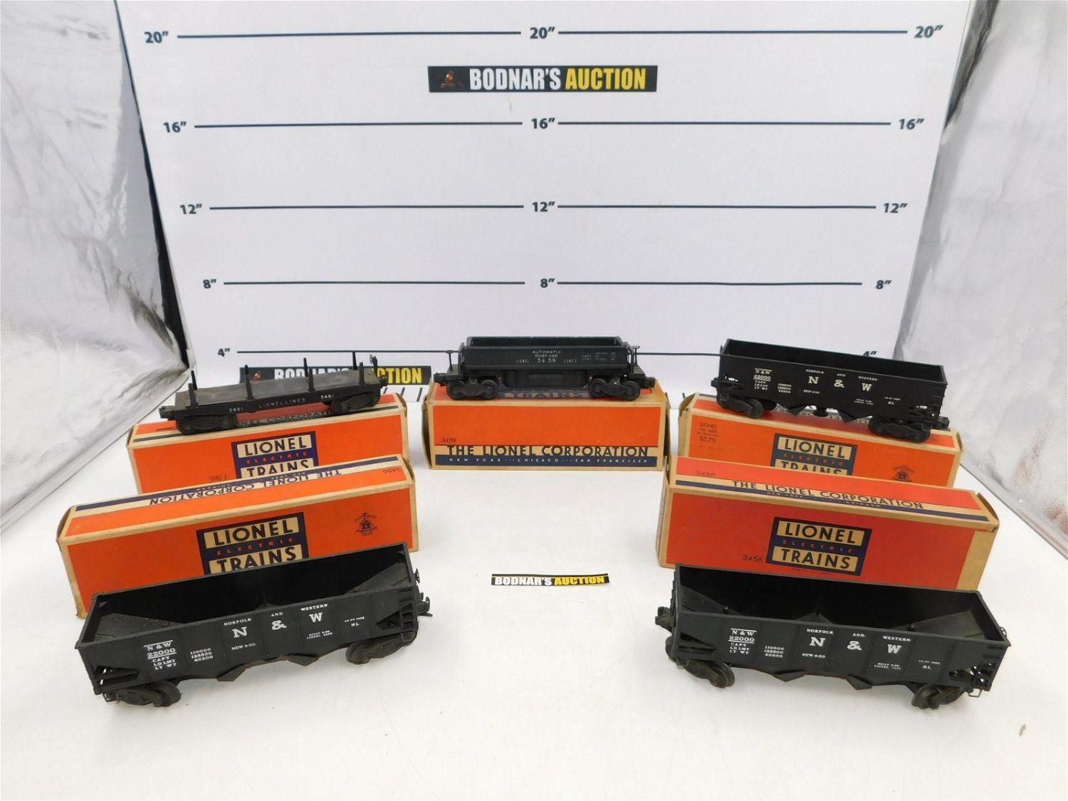 Lot of 5 Lionel O Gauge Rolling Stock including (3) Operating Hopper #3456, Lionel Lines Operating Flatcar #3461, and Automatic Dump Car #3459. 4 have original boxes. Boxes have wear. All invoices must be paid within 24 hours of the sale. No trains have been tested to be working. All lots ship Liveauctioneers Live Ship, to get a quote see the truck icon on this listing. You can Opt out of Live Shipping and use the Local UPS Store or arrange your own shipping . Local pickups are at our Monmouth Junction location on Friday, Saturday and Monday ONLY! All pickups are by appointment only. Any condition issues will be listed in the description. Please read the terms for full information.