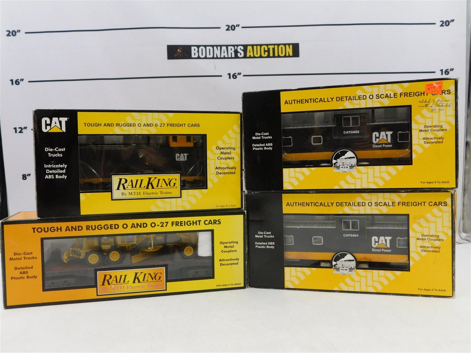 Lot of 4 MTH O Gauge Rolling Stock including (3) CAT Cabooses 2 x 91115 and 77104, and CAT Flat Car with Motor Grader 7673. All in original boxes. Please read the terms and conditions. This sale will be broadcast live on sale day with full descriptions of each lot being sold. All items MUST be paid for within 24 HOURS of the sale. All lots ship Liveauctioneers Live Ship, to get a quote see the truck icon on this listing. You can Opt out of Live Shipping and use the Local UPS Store or arrange your own shipping . If you are picking your items up you must contact us NO LATER than 24 hours after the sale to schedule an appointment to pick up. Pick up dates are Thursday, Friday, Saturday, and Monday ONLY, and are BY APPOINTMENT ONLY!! No trains have been tested to be working. Any condition issues will be listed in the description. Please read the terms for full information.