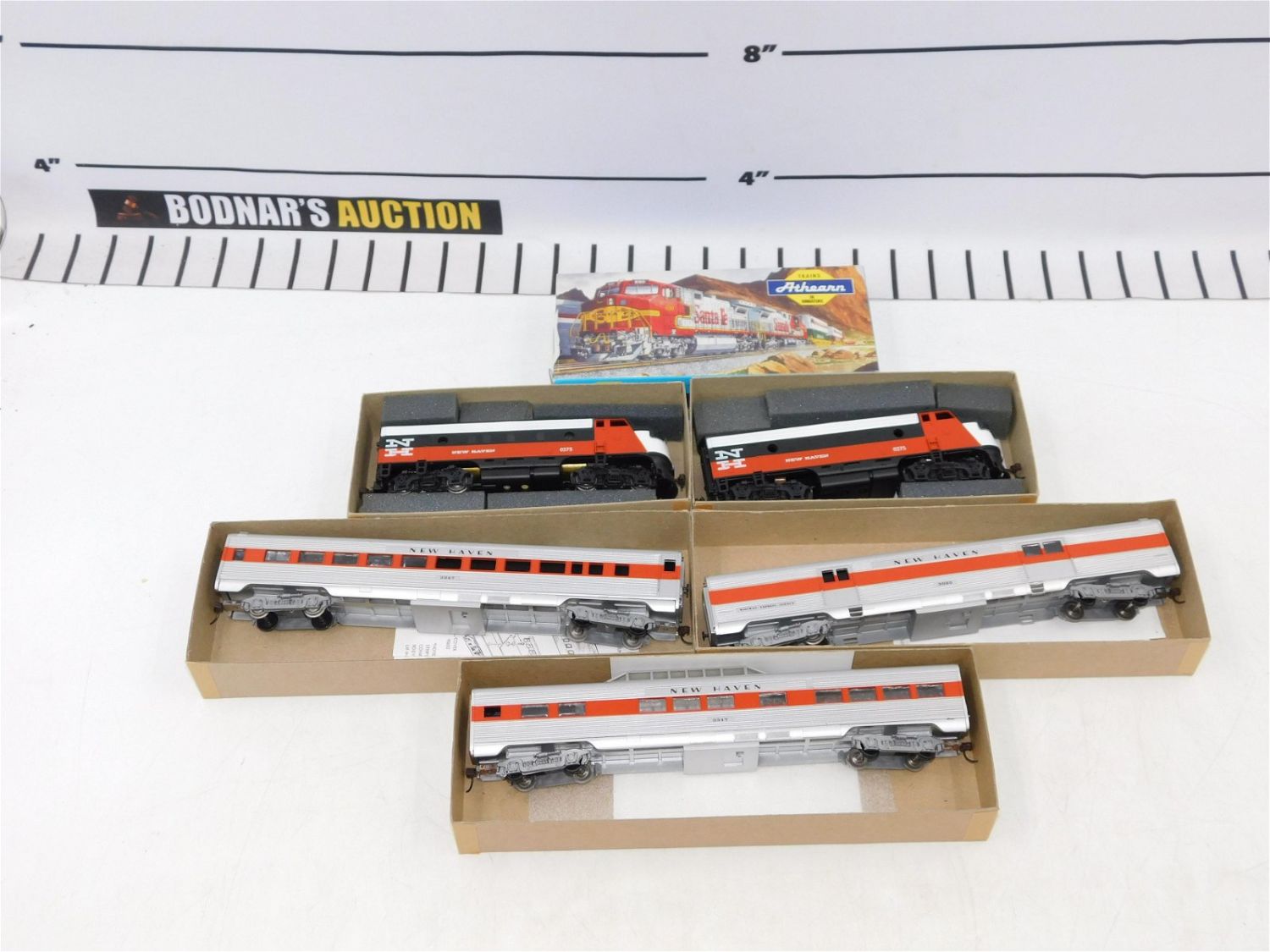 Athearn HO Scale New Haven Passenger Car Set. Includes F7A Super P 3221, F7A Dummy 3201, 5344 Boxcar, 1824 Vista Dome and 1814 Coach. All come with original boxes. Please read the terms and conditions. This sale will be broadcast live on sale day with full descriptions of each lot being sold. All items MUST be paid for within 24 HOURS of the sale. All lots ship Liveauctioneers Live Ship, to get a quote see the truck icon on this listing. You can Opt out of Live Shipping and use the Local UPS Store or arrange your own shipping . If you are picking your items up you must contact us NO LATER than 24 hours after the sale to schedule an appointment to pick up. Pick up dates are Thursday, Friday, Saturday, and Monday ONLY, and are BY APPOINTMENT ONLY!! No trains have been tested to be working. Any condition issues will be listed in the description. Please read the terms for full information.