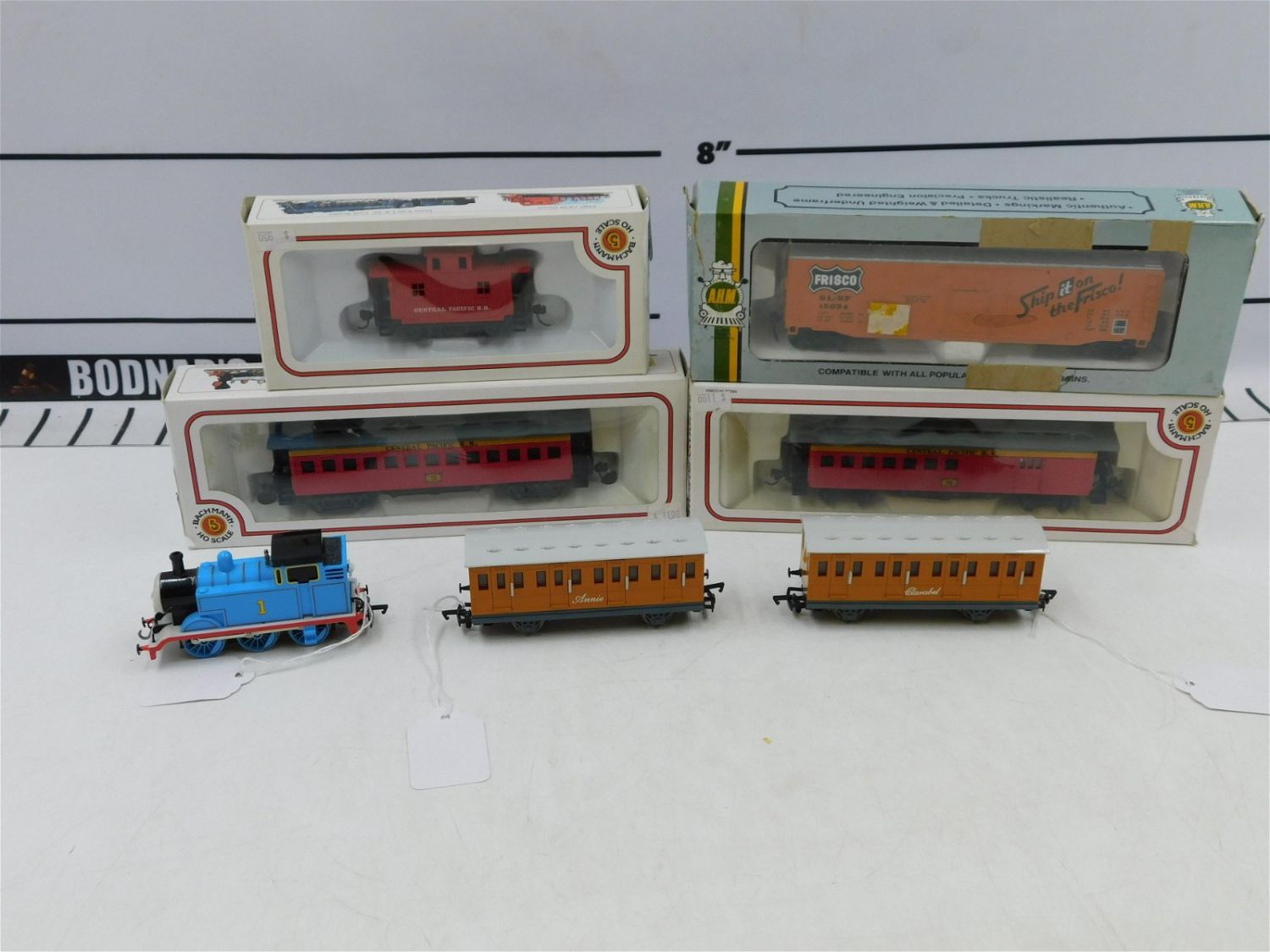 Lot of 7 HO Scale Trains including 6 Bachmann – Central Pacific Caboose 72724, Central Pacific Coach 72924, Central Old Time Combine 72824, Thomas the Train Engine (no box), Annie Coach Car, and Clarabelle Coach Car. Also including is an AHM Frisco Boxcar. All come in original boxes except Thomas Engine. Please read the terms and conditions. This sale will be broadcast live on sale day with full descriptions of each lot being sold. All items MUST be paid for within 24 HOURS of the sale. All lots ship Liveauctioneers Live Ship, to get a quote see the truck icon on this listing. You can Opt out of Live Shipping and use the Local UPS Store or arrange your own shipping . If you are picking your items up you must contact us NO LATER than 24 hours after the sale to schedule an appointment to pick up. Pick up dates are Thursday, Friday, Saturday, and Monday ONLY, and are BY APPOINTMENT ONLY!! No trains have been tested to be working. Any condition issues will be listed in the description. Please read the terms for full information.