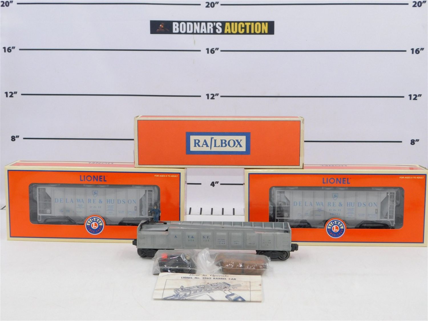 Lot of 3 Lionel O Gauge Brake Cars including Gray Barrel Car with Barrels 3562-25 with repro box and (2) D&H Cement Hoppers 53246 in original boxes. Please read the terms and conditions. This sale will be broadcast live on sale day with full descriptions of each lot being sold. All items MUST be paid for within 24 HOURS of the sale. All lots ship Liveauctioneers Live Ship, to get a quote see the truck icon on this listing. You can Opt out of Live Shipping and use the Local UPS Store or arrange your own shipping . If you are picking your items up you must contact us NO LATER than 24 hours after the sale to schedule an appointment to pick up. Pick up dates are Thursday, Friday, Saturday, and Monday ONLY, and are BY APPOINTMENT ONLY!! No trains have been tested to be working. Any condition issues will be listed in the description. Please read the terms for full information.