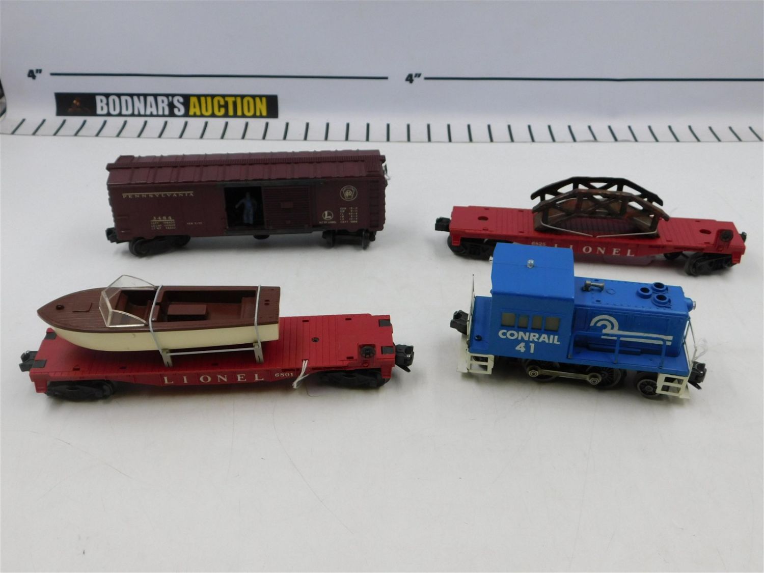 Lot of 4 Lionel Postwar O Gauge Rolling Stock including PRR Operating Boxcar 3484, Customized Flat Car with Plasticville Bridge 6825, Flat Car 6801, and Customized Conrail Switcher #41 with Cracked Strut. Please read the terms and conditions. This sale will be broadcast live on sale day with full descriptions of each lot being sold. All items MUST be paid for within 24 HOURS of the sale. All lots ship Liveauctioneers Live Ship, to get a quote see the truck icon on this listing. You can Opt out of Live Shipping and use the Local UPS Store or arrange your own shipping . If you are picking your items up you must contact us NO LATER than 24 hours after the sale to schedule an appointment to pick up. Pick up dates are Thursday, Friday, Saturday, and Monday ONLY, and are BY APPOINTMENT ONLY!! No trains have been tested to be working. Any condition issues will be listed in the description. Please read the terms for full information.