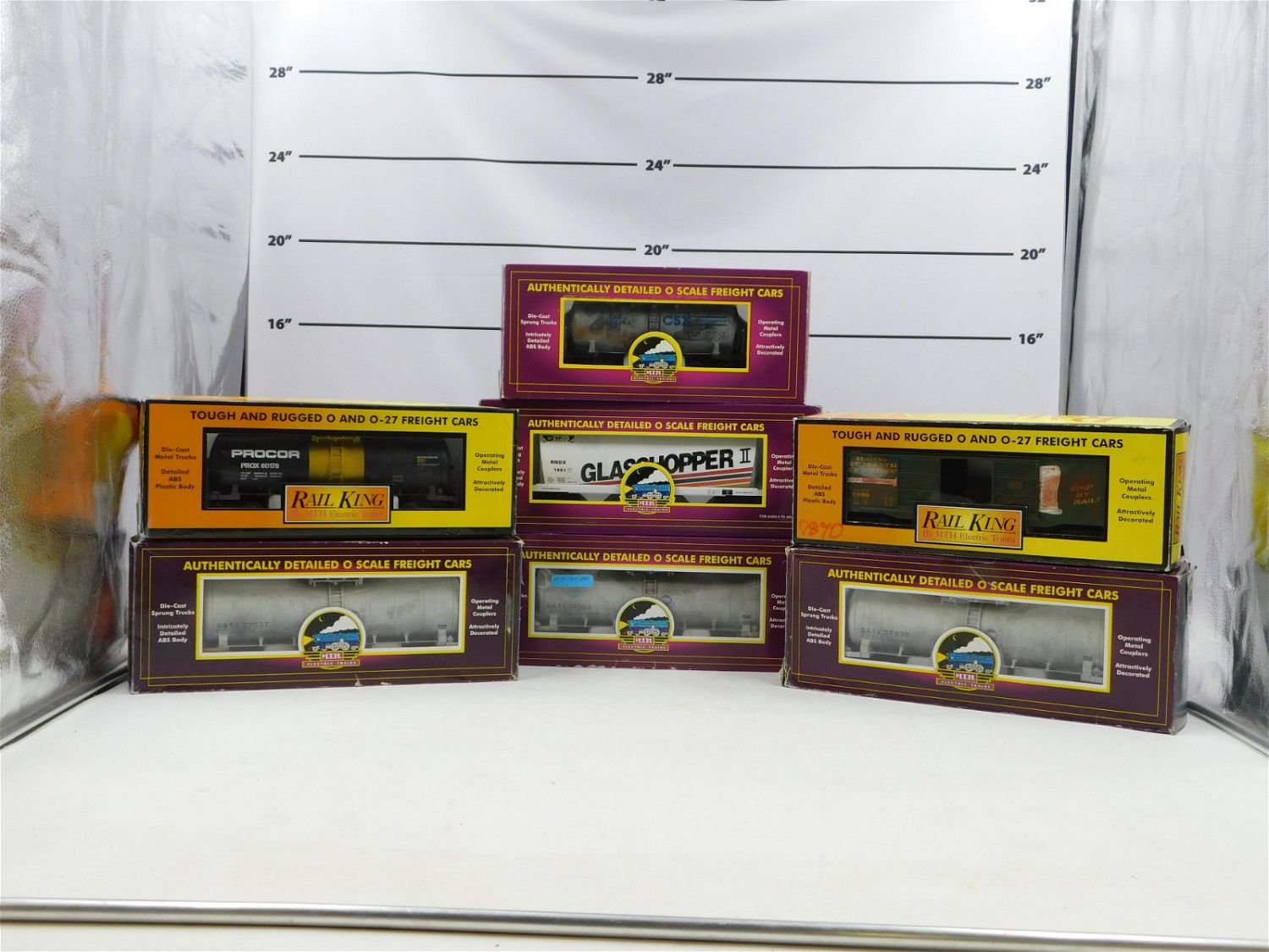 Lot of 7 MTH and Rail King O Gauge Rolling Stock including CSX Tank Car 63826, Procor Tank Car 73395, (3) GATX Tank Car 33037, 37930, and 39303, Rail King Reading Blue Mountain Boxcar 74623, Hopper 2 97442. All customized and weathered. 4 Come in original box. Please read the terms and conditions. This sale will be broadcast live on sale day with full descriptions of each lot being sold. All items MUST be paid for within 24 HOURS of the sale. All lots ship Liveauctioneers Live Ship, to get a quote see the truck icon on this listing. You can Opt out of Live Shipping and use the Local UPS Store or arrange your own shipping . If you are picking your items up you must contact us NO LATER than 24 hours after the sale to schedule an appointment to pick up. Pick up dates are Thursday, Friday, Saturday, and Monday ONLY, and are BY APPOINTMENT ONLY!! No trains have been tested to be working. Any condition issues will be listed in the description. Please read the terms for full information.