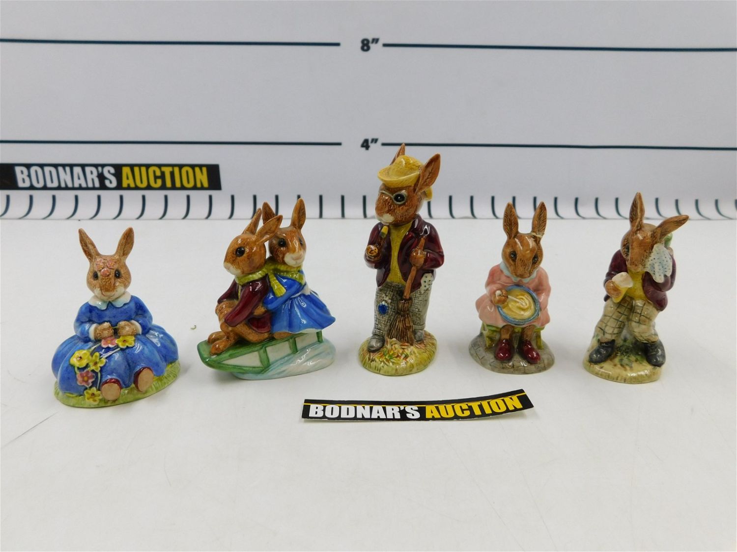 Lot of 5 Royal Doulton Bunnykins Figurines including Billie & Buntie Bunnykins, Billie Bunnykins, Buntie Bunnykins (Repaired Ear), Daisie Bunnykins, and Mr. Bunnykins. Measures 3.25" tall – 4.5" tall. All invoices must be paid within 24 hours of the sale. If you need your items shipped, we are using Liveauctioneers Live Ship. They will pack it and ship it to you and it will be on your invoice at check out. You can also use your own shiper. Local pickups are at our Monmouth Junction location on Friday, Saturday and Monday ONLY! All pickups are by appointment only. Any condition issues will be listed in the description. Please read the terms for full information.