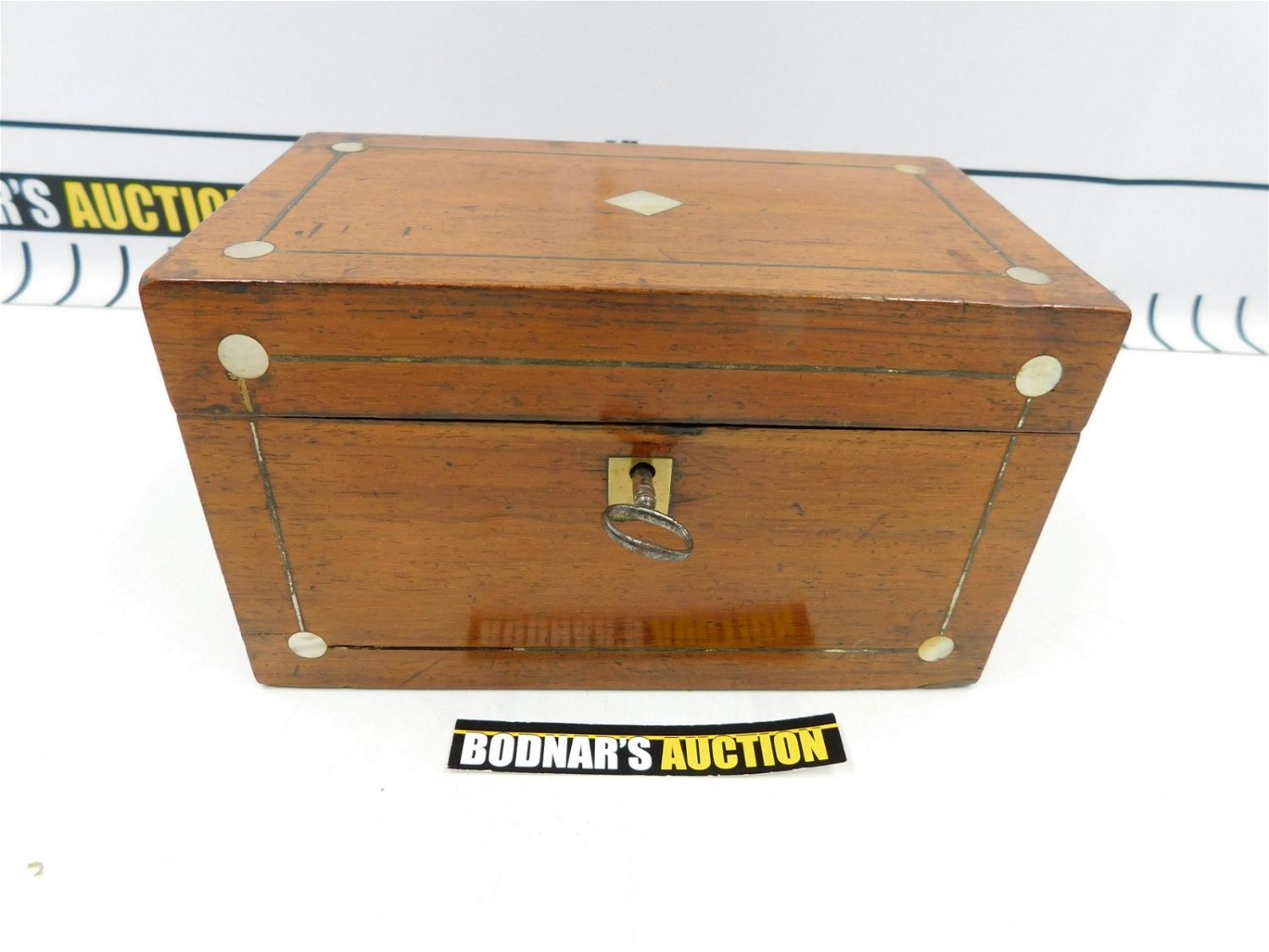19th Century English Wooden Tea Caddy with Mother of Pearl Inlay and inside wooden covers. Has Key. Measures 8" wide x 4.75" deep x 4.75" tall. All invoices must be paid within 24 hours of the sale. If you need your items shipped, we are using Liveauctioneers Live Ship. They will pack it and ship it to you and it will be on your invoice at check out. You can also use your own shiper. Local pickups are at our Monmouth Junction location on Friday, Saturday and Monday ONLY! All pickups are by appointment only. Any condition issues will be listed in the description. Please read the terms for full information.