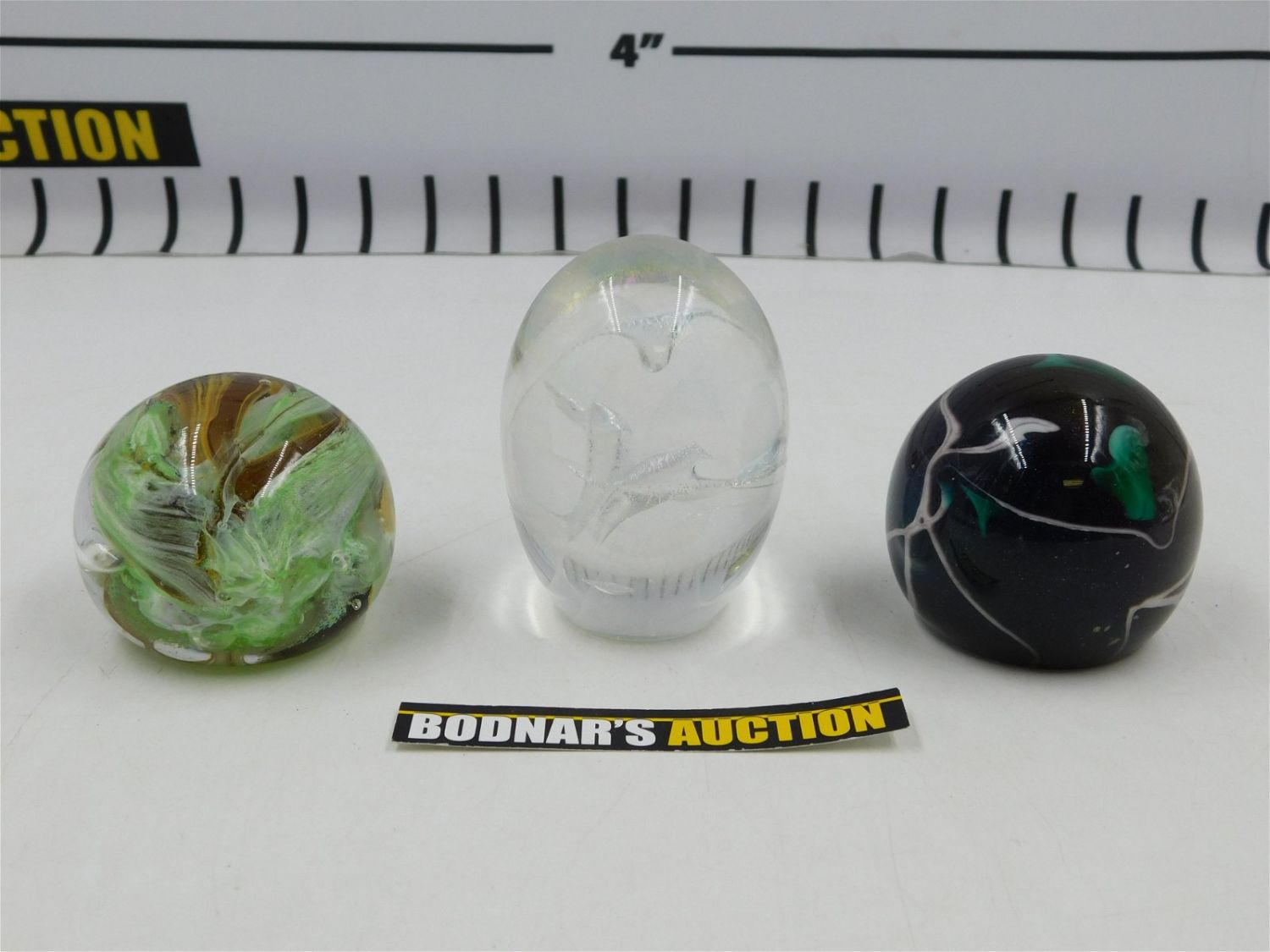 Lot of 3 Art Glass Paperweights. Two are artist signed on bottom. Measures 2" – 3.5" tall. All invoices must be paid within 24 hours of the sale. If you need your items shipped, we are using Liveauctioneers Live Ship. They will pack it and ship it to you and it will be on your invoice at check out. You can also use your own shiper. Local pickups are at our Monmouth Junction location on Friday, Saturday and Monday ONLY! All pickups are by appointment only. Any condition issues will be listed in the description. Please read the terms for full information.