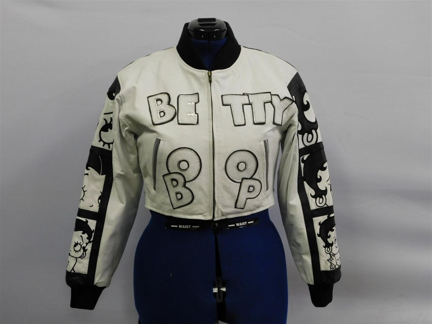 American Toons by Excelled Betty Boop Cropped Waist Leather Jacket. Size Small. Jacket measures 20" long from top of neck in back to waist. Some light wear to white leather. All invoices must be paid within 24 hours of the sale. If you need your items shipped, we are using Liveauctioneers Live Ship. They will pack it and ship it to you and it will be on your invoice at check out. You can also use your own shiper. Local pickups are at our Monmouth Junction location on Friday, Saturday and Monday ONLY! All pickups are by appointment only. Any condition issues will be listed in the description. Please read the terms for full information.
