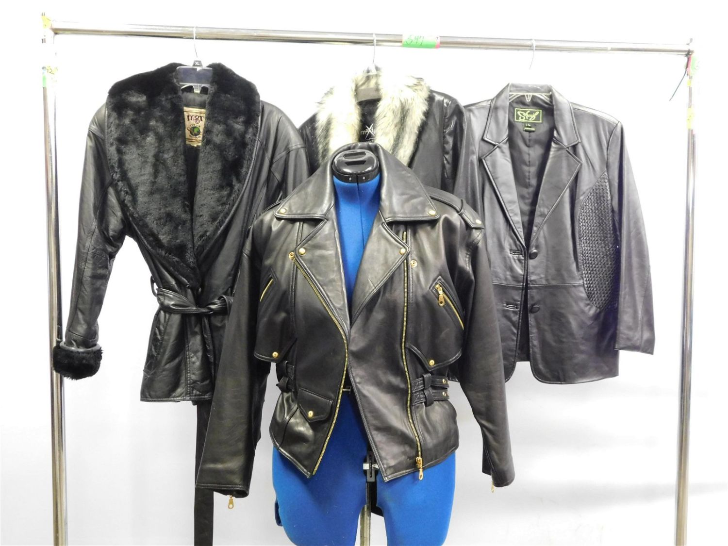 Grouping of 4 Women’s Leather Jackets including Wilson Maxima with Faux Collar – Size Small, Studio Siena – Black Riding Style Jacket – Size XS, Sharif Studio with Braided Panel Design – Size Large, and Mgr. Its Our Universe with Faux Collar – Size Small. Measures 24" – 32" long. All invoices must be paid within 24 hours of the sale. If you need your items shipped, we are using Liveauctioneers Live Ship. They will pack it and ship it to you and it will be on your invoice at check out. You can also use your own shiper. Local pickups are at our Monmouth Junction location on Friday, Saturday and Monday ONLY! All pickups are by appointment only. Any condition issues will be listed in the description. Please read the terms for full information.