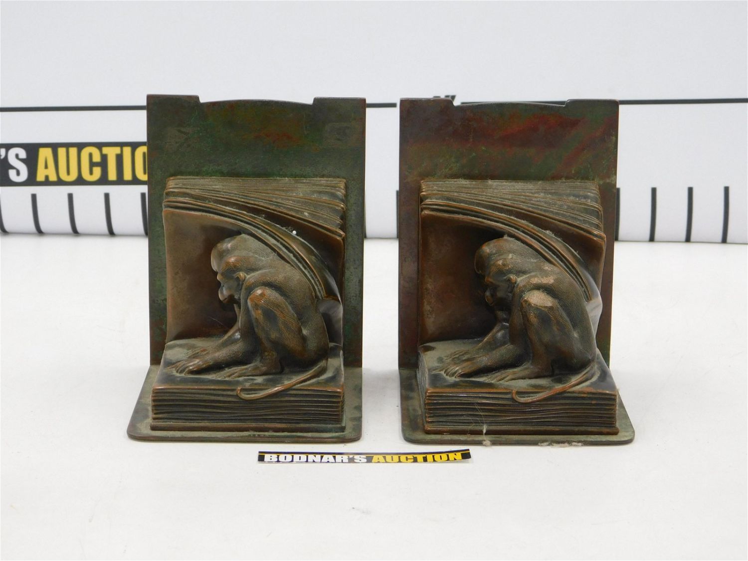 Pair of Bronze and Mixed Metal Art Deco Bookends. Depicting Monkeys Reading a Book. One needs to be reattached to base. Marked on back JB 4262. Measures 6" x 5" x 4". All invoices must be paid within 24 hours of the sale. If you need your items shipped, we are using Liveauctioneers Live Ship. They will pack it and ship it to you and it will be on your invoice at check out. You can also use your own shiper. Local pickups are at our Monmouth Junction location on Friday, Saturday and Monday ONLY! All pickups are by appointment only. Any condition issues will be listed in the description. Please read the terms for full information.