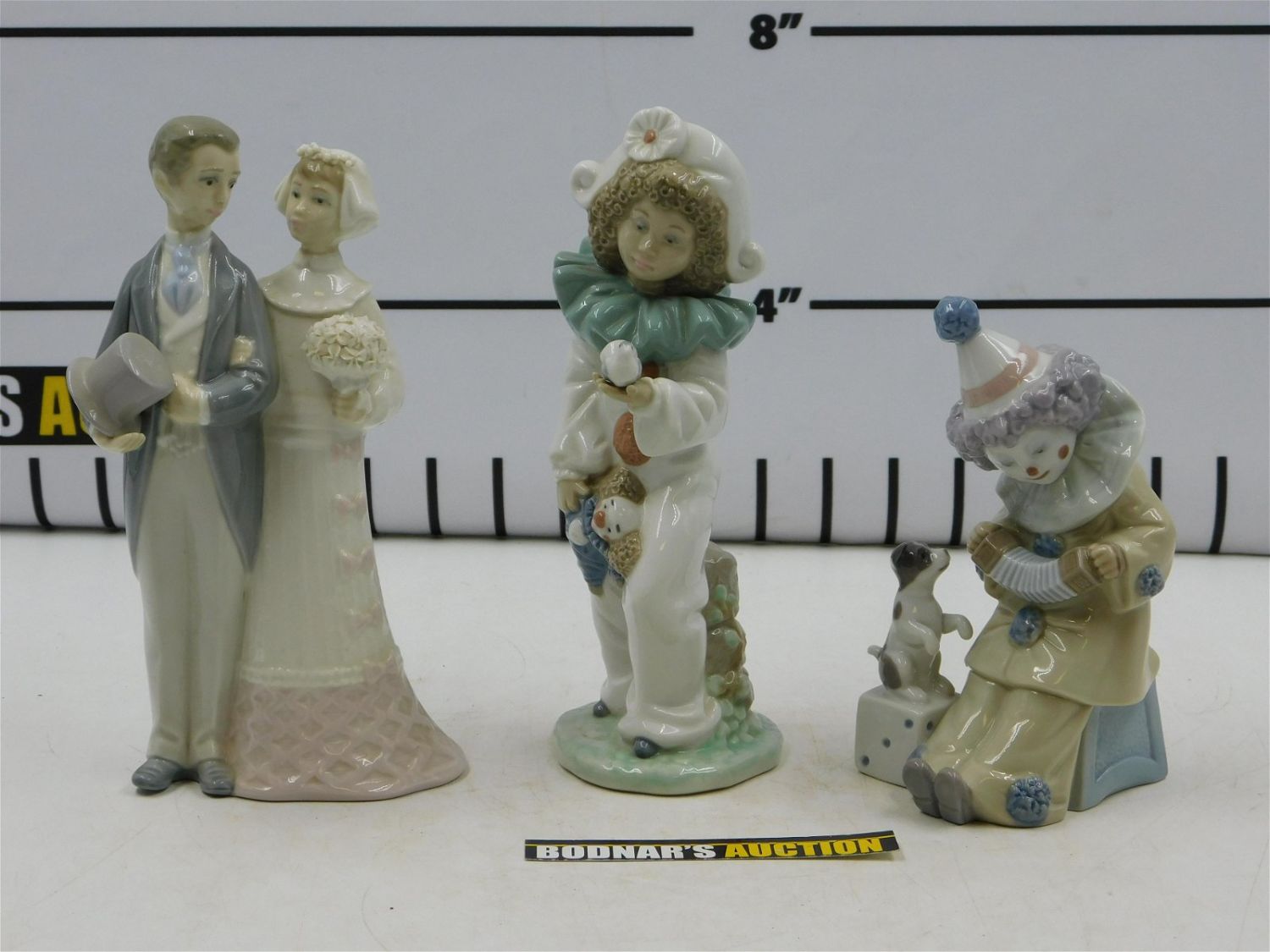 Lot of Lladro and Nao Figurines including Lladro 4808 Bride and Groom, Lladro 5279 Pierrot with Concertina, and NAO 1100 – Harlequin with Bird. Measures 6" – 7.75" tall x 2.5" – 3.5" wide. All invoices must be paid within 24 hours of the sale. If you need your items shipped, we are using Liveauctioneers Live Ship. They will pack it and ship it to you and it will be on your invoice at check out. You can also use your own shiper. Local pickups are at our Monmouth Junction location on Friday, Saturday and Monday ONLY! All pickups are by appointment only. Any condition issues will be listed in the description. Please read the terms for full information.