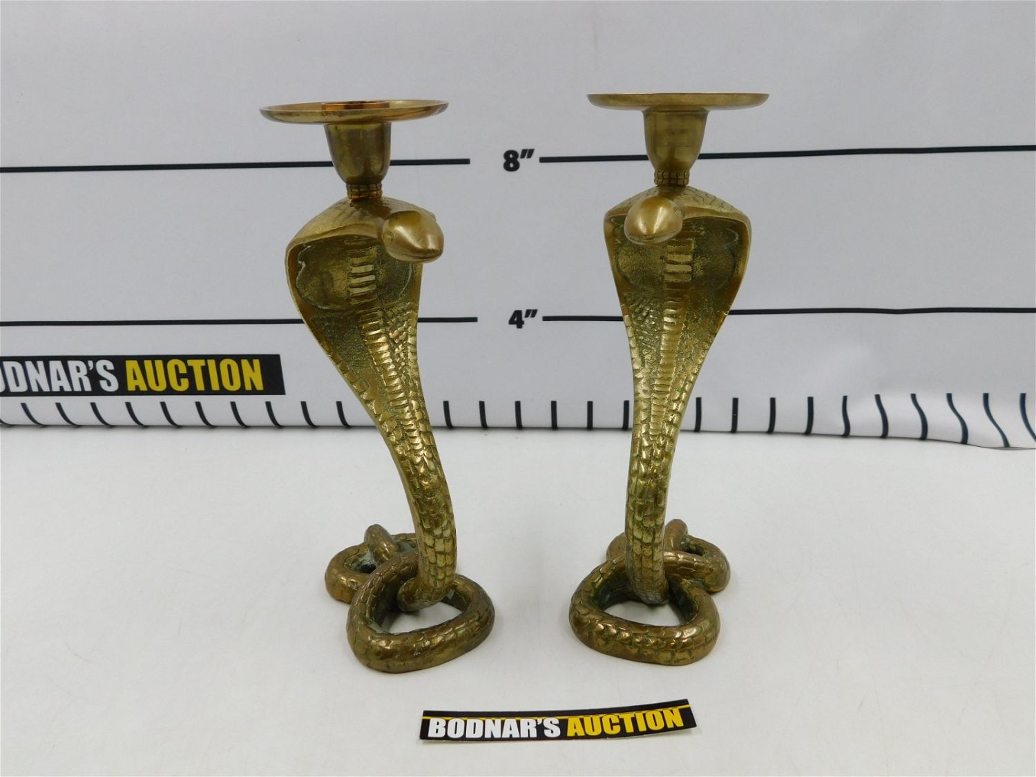 Pair of Solid Brass Cobra Snake Candlesticks. Measures approx. 9" tall. All invoices must be paid within 24 hours of the sale. If you need your items shipped, we are using Liveauctioneers Live Ship. They will pack it and ship it to you and it will be on your invoice at check out. You can also use your own shiper. Local pickups are at our Monmouth Junction location on Friday, Saturday and Monday ONLY! All pickups are by appointment only. Any condition issues will be listed in the description. Please read the terms for full information.