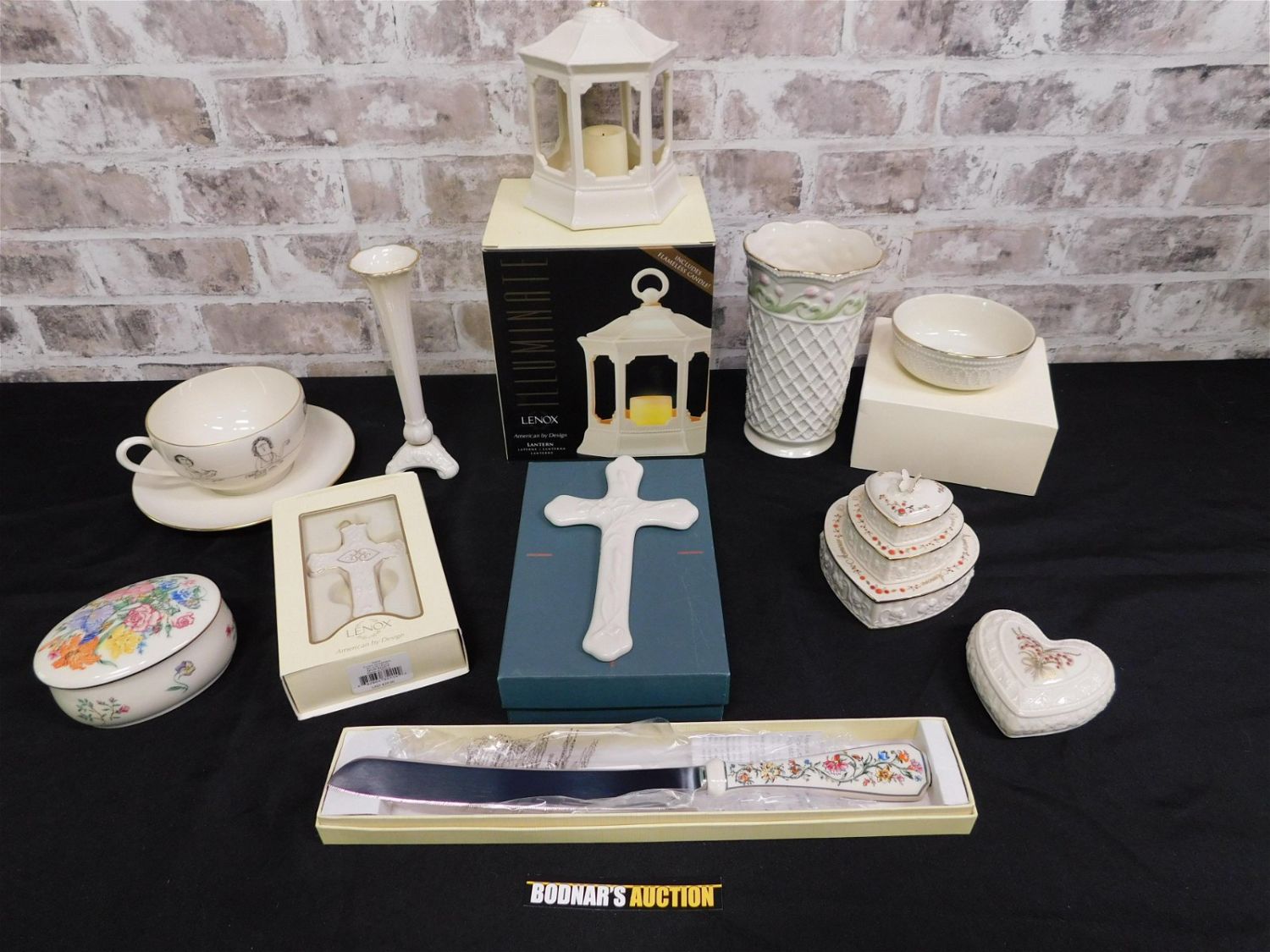 Group Lot of Lenox including Illuminate Lantern in Box, Small Bowl in Box, Vase, Bud Vase, Cross in Box, Cross Ornament in Box, Cake Knife in Box, Cup and Saucer, Flower Blossom Music Box, Heart Figurine, and Stackable Heart Votive. Please read the terms and conditions. This sale will be broadcast live on sale day with full descriptions of each lot being sold. All items MUST be paid for within 24 HOURS of the sale. Anyone who has not paid within 24 hours will have a dispute opened against them and will not be able to bid at future sales. If you need your items shipped, we wwe are using Liveauctioneers Live Ship. They will pack it and ship it to you and it will be on your invoice at check out. They will pack it and ship it to you and you will pay them separately and directly. You can also use your own shiper. If you are picking your items up you must contact us NO LATER than 24 hours after the sale to schedule an appointment to pick up. Pick up dates are Thursday, Friday, Saturday, and Monday ONLY, and are BY APPOINTMENT ONLY!! After Monday, if you have not picked up your items, they will be disposed of.