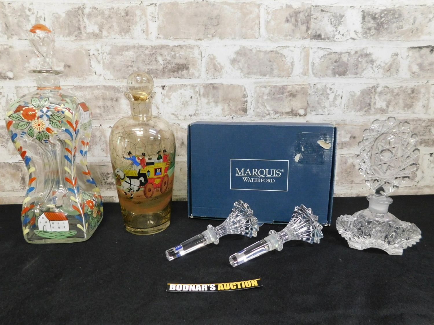 Mixed Lot of Glassware including Marquis Waterford Wine Stopper in original box, Pressed Glass Perfume Bottle, Hand Painted Decanter, and Transferware Decanter. Please read the terms and conditions. This sale will be broadcast live on sale day with full descriptions of each lot being sold. All items MUST be paid for within 24 HOURS of the sale. Anyone who has not paid within 24 hours will have a dispute opened against them and will not be able to bid at future sales. If you need your items shipped, we wwe are using Liveauctioneers Live Ship. They will pack it and ship it to you and it will be on your invoice at check out. They will pack it and ship it to you and you will pay them separately and directly. You can also use your own shiper. If you are picking your items up you must contact us NO LATER than 24 hours after the sale to schedule an appointment to pick up. Pick up dates are Thursday, Friday, Saturday, and Monday ONLY, and are BY APPOINTMENT ONLY!! After Monday, if you have not picked up your items, they will be disposed of.