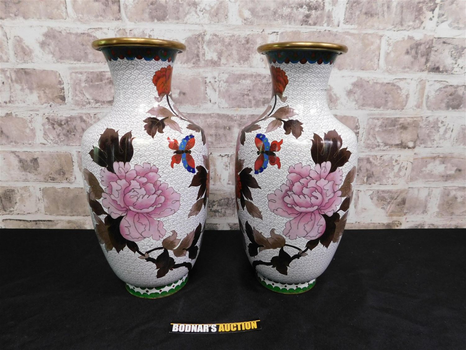 Pair of Cloisonne Vases. One vase has a repair on the top neck area. Measures 12.25" tall. Please read the terms and conditions. This sale will be broadcast live on sale day with full descriptions of each lot being sold. All items MUST be paid for within 24 HOURS of the sale. Anyone who has not paid within 24 hours will have a dispute opened against them and will not be able to bid at future sales. If you need your items shipped, we wwe are using Liveauctioneers Live Ship. They will pack it and ship it to you and it will be on your invoice at check out. They will pack it and ship it to you and you will pay them separately and directly. You can also use your own shiper. If you are picking your items up you must contact us NO LATER than 24 hours after the sale to schedule an appointment to pick up. Pick up dates are Thursday, Friday, Saturday, and Monday ONLY, and are BY APPOINTMENT ONLY!! After Monday, if you have not picked up your items, they will be disposed of.