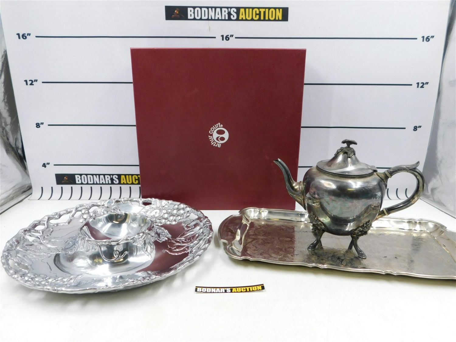 Lot of Silverplate including Teapot, Serving Tray and an Author Court Chip & Dip Serving Dish in Box. Please read the terms and conditions. This sale will be broadcast live on sale day with full descriptions of each lot being sold. All items MUST be paid for within 24 HOURS of the sale. Anyone who has not paid within 24 hours will have a dispute opened against them and will not be able to bid at future sales. If you need your items shipped, we wwe are using Liveauctioneers Live Ship. They will pack it and ship it to you and it will be on your invoice at check out. They will pack it and ship it to you and you will pay them separately and directly. You can also use your own shiper. If you are picking your items up you must contact us NO LATER than 24 hours after the sale to schedule an appointment to pick up. Pick up dates are Thursday, Friday, Saturday, and Monday ONLY, and are BY APPOINTMENT ONLY!! After Monday, if you have not picked up your items, they will be disposed of.