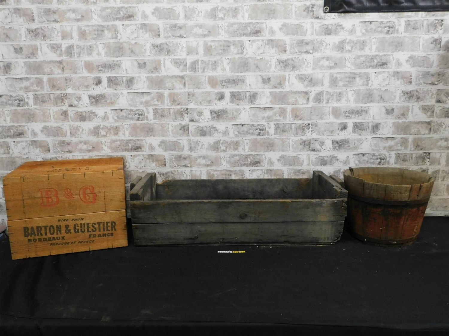 Lot of Wooden Items including Feeding Bin measuring 32" long x 13.5" deep x 8" tall, Feeding Bucket measuring 12" diameter x 9.5" tall and B&G Wine Crate with Lid measuring 14.75" wide x 11" deep x 12" tall. Please read the terms and conditions. This sale will be broadcast live on sale day with full descriptions of each lot being sold. All items MUST be paid for within 24 HOURS of the sale. Anyone who has not paid within 24 hours will have a dispute opened against them and will not be able to bid at future sales. If you need your items shipped, we wwe are using Liveauctioneers Live Ship. They will pack it and ship it to you and it will be on your invoice at check out. They will pack it and ship it to you and you will pay them separately and directly. You can also use your own shiper. If you are picking your items up you must contact us NO LATER than 24 hours after the sale to schedule an appointment to pick up. Pick up dates are Thursday, Friday, Saturday, and Monday ONLY, and are BY APPOINTMENT ONLY!! After Monday, if you have not picked up your items, they will be disposed of.
