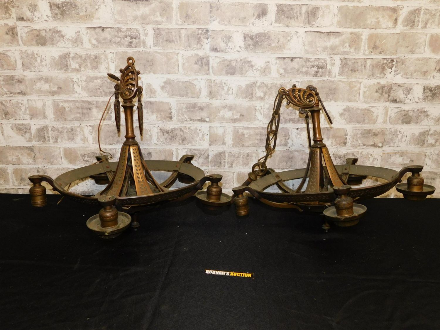 Pair of Art Deco Metal Hanging Chandeliers. 3 fitters are missing the metal decoration. Measures 18" diameter x 30.5" tall. Please read the terms and conditions. This sale will be broadcast live on sale day with full descriptions of each lot being sold. All items MUST be paid for within 24 HOURS of the sale. Anyone who has not paid within 24 hours will have a dispute opened against them and will not be able to bid at future sales. If you need your items shipped, we wwe are using Liveauctioneers Live Ship. They will pack it and ship it to you and it will be on your invoice at check out. They will pack it and ship it to you and you will pay them separately and directly. You can also use your own shiper. If you are picking your items up you must contact us NO LATER than 24 hours after the sale to schedule an appointment to pick up. Pick up dates are Thursday, Friday, Saturday, and Monday ONLY, and are BY APPOINTMENT ONLY!! After Monday, if you have not picked up your items, they will be disposed of.