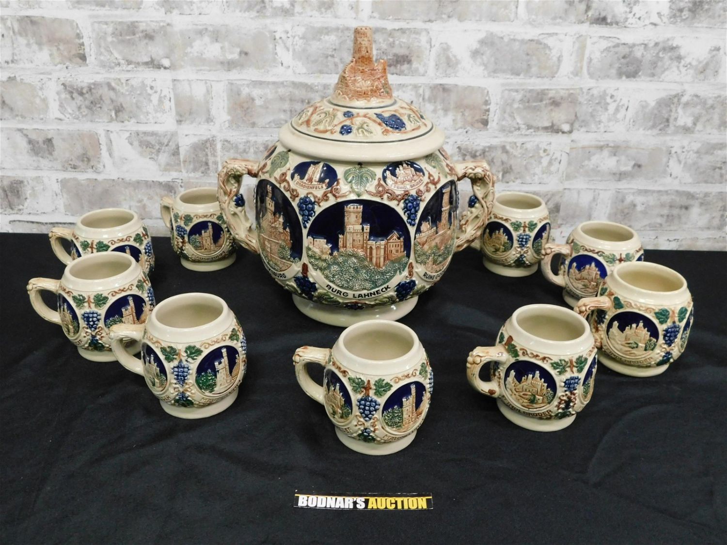 Gerzit Germany Castles on the Rhein Punch Bowl Set. Includes Punch Bowl measuring 12" diameter x 12" tall and with 9 Cups. Please read the terms and conditions. This sale will be broadcast live on sale day with full descriptions of each lot being sold. All items MUST be paid for within 24 HOURS of the sale. Anyone who has not paid within 24 hours will have a dispute opened against them and will not be able to bid at future sales. If you need your items shipped, we wwe are using Liveauctioneers Live Ship. They will pack it and ship it to you and it will be on your invoice at check out. They will pack it and ship it to you and you will pay them separately and directly. You can also use your own shiper. If you are picking your items up you must contact us NO LATER than 24 hours after the sale to schedule an appointment to pick up. Pick up dates are Thursday, Friday, Saturday, and Monday ONLY, and are BY APPOINTMENT ONLY!! After Monday, if you have not picked up your items, they will be disposed of.