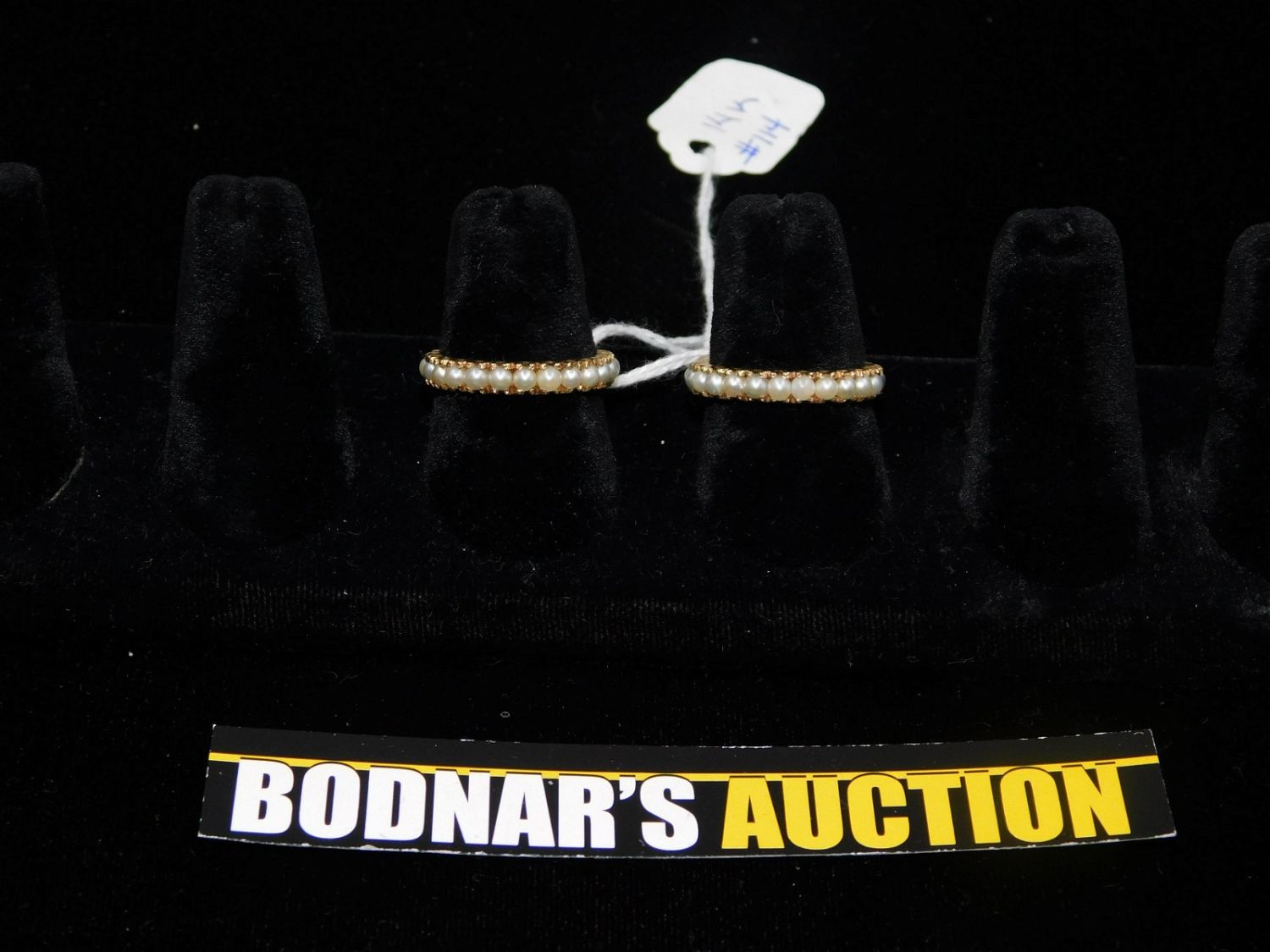 Pair of 14K yellow gold and seed pearl ladies bands. Tested, not marked. Size 7 1/2". All invoices must be paid within 24 hours of the sale. All items are shipped USPS or UPS and will be billed separately. A $12 handling fee is added to the shipping price per lot if shipped in house. Some items or large quantity of purchases will be packed and shipped via the UPS store. Local pickups are at our South Brunswick location on Friday, Saturday and Monday ONLY! All pickups are by appointment only. Any condition issues will be listed in the description. Please read the terms for full information.