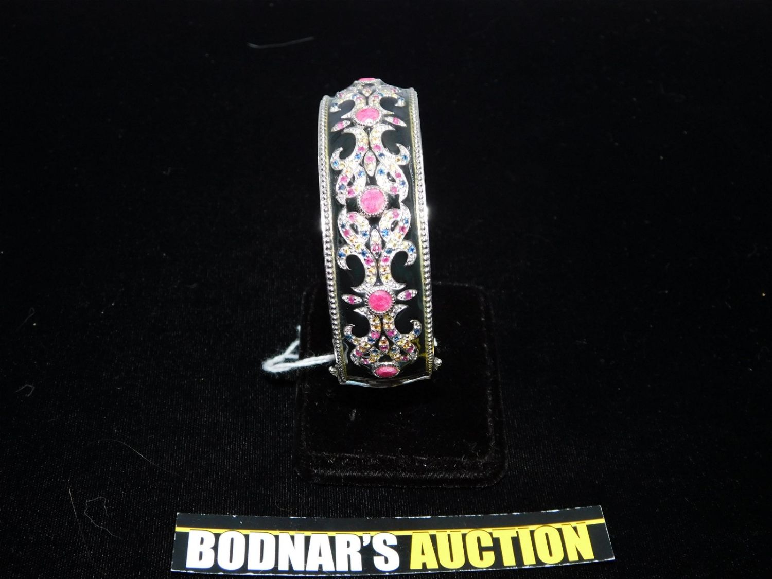 Sterling silver, enamel and gemstone hinged bangle bracelet. Has 2 safety clasps and is marked 925, EA on the inside near the clasp. Measures approx. 2 5/8" across. All invoices must be paid within 24 hours of the sale. All items are shipped USPS or UPS and will be billed separately. A $12 handling fee is added to the shipping price per lot if shipped in house. Some items or large quantity of purchases will be packed and shipped via the UPS store. Local pickups are at our South Brunswick location on Friday, Saturday and Monday ONLY! All pickups are by appointment only. Any condition issues will be listed in the description. Please read the terms for full information.