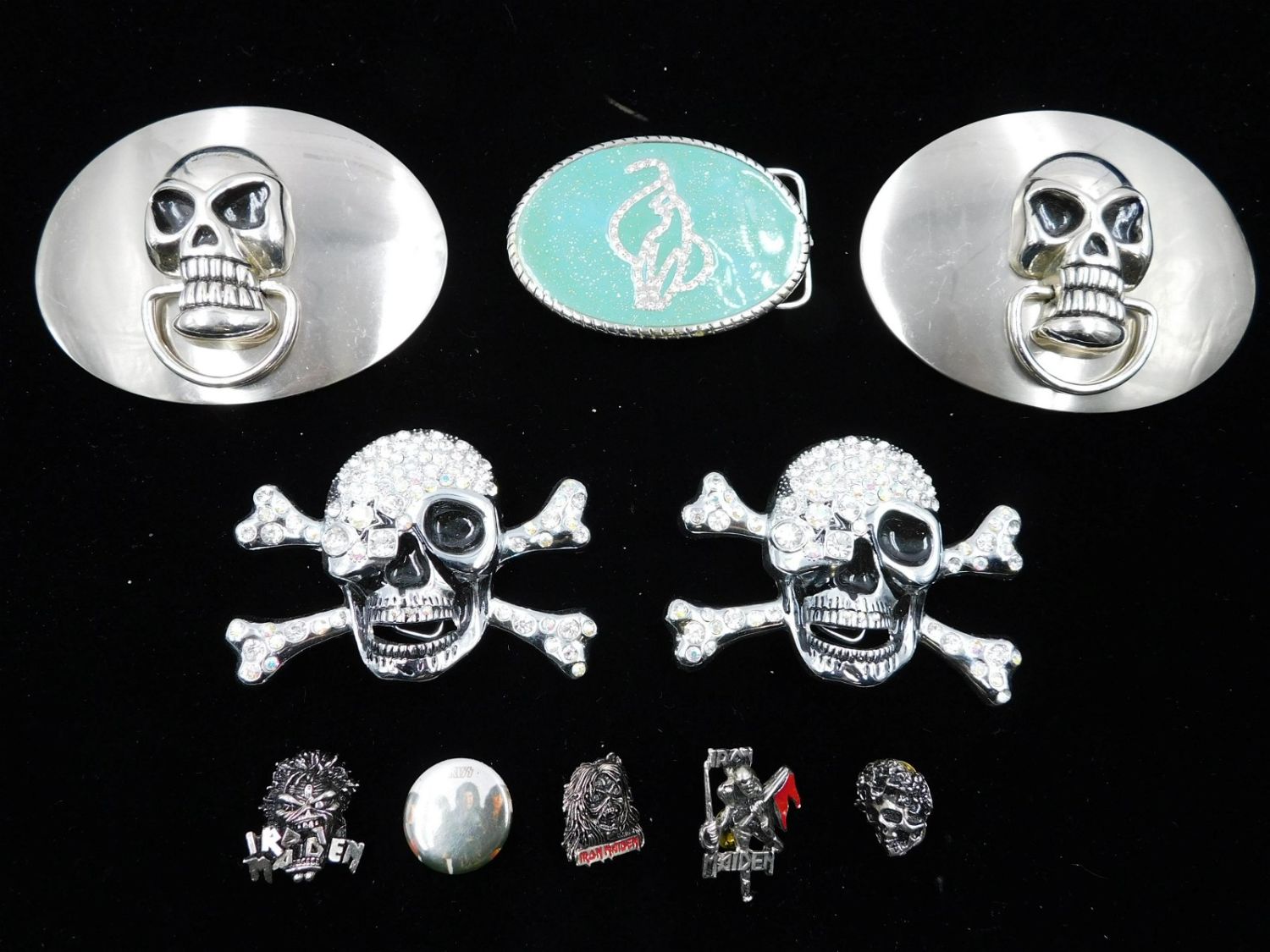 Lot of silvertone belt buckles and pins. 4 skull belt buckles, 2 with rhinestones, a Baby Phat enamel and rhinestone buckle, and assorted pins including Iron Maiden and Kiss. Some have light scratches. All invoices must be paid within 24 hours of the sale. All items are shipped USPS or UPS and will be billed separately. A $12 handling fee is added to the shipping price per lot if shipped in house. Some items or large quantity of purchases will be packed and shipped via the UPS store. Local pickups are at our South Brunswick location on Friday, Saturday and Monday ONLY! All pickups are by appointment only. Any condition issues will be listed in the description. Please read the terms for full information.