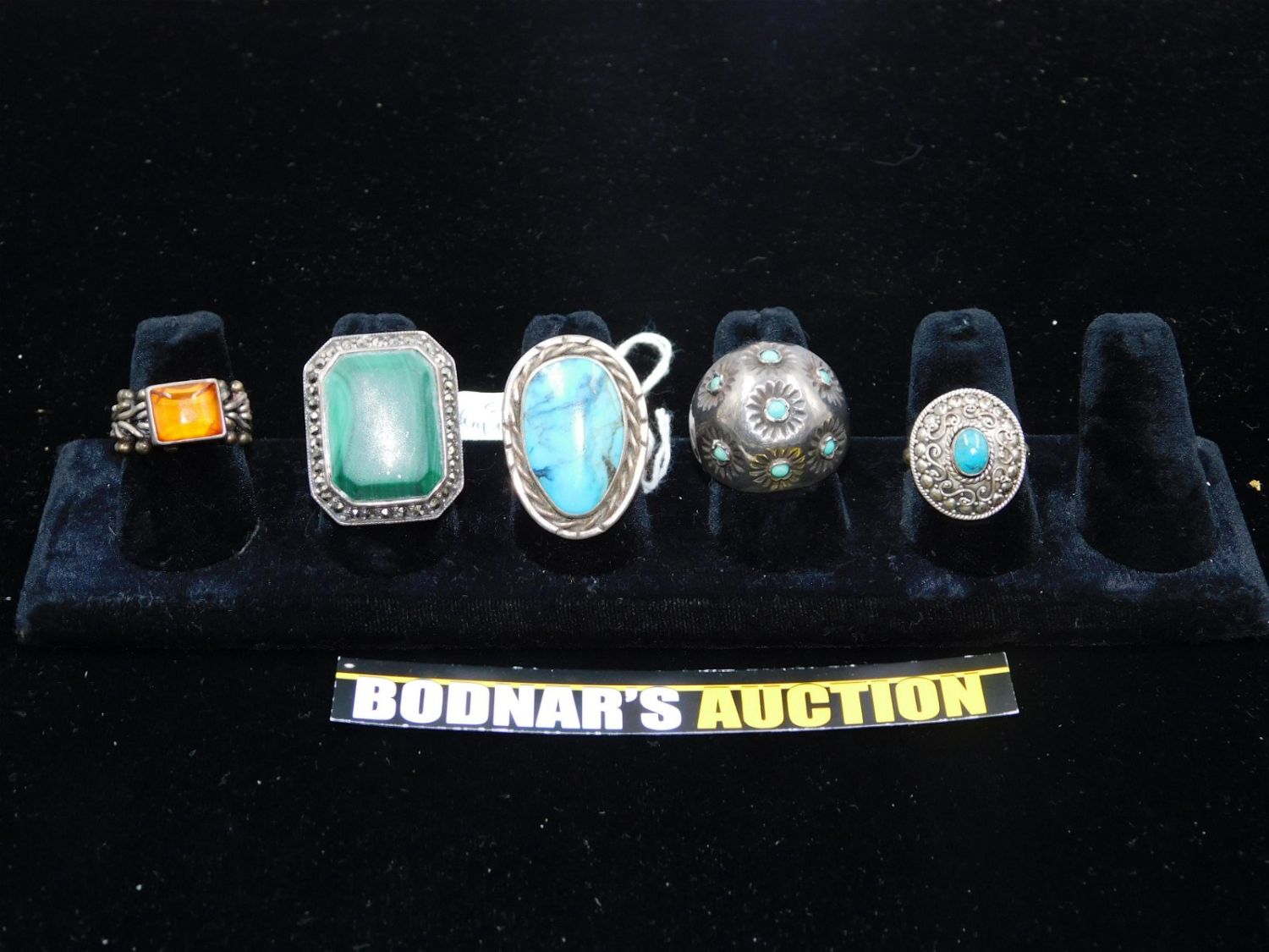 Lot of 5 sterling rings including a large green stone, 3 turquoise and an amber style stone. Sizes 5 1/2- 8. All invoices must be paid within 24 hours of the sale. All items are shipped USPS or UPS and will be billed separately. A $12 handling fee is added to the shipping price per lot if shipped in house. Some items or large quantity of purchases will be packed and shipped via the UPS store. Local pickups are at our South Brunswick location on Friday, Saturday and Monday ONLY! All pickups are by appointment only. Any condition issues will be listed in the description. Please read the terms for full information.