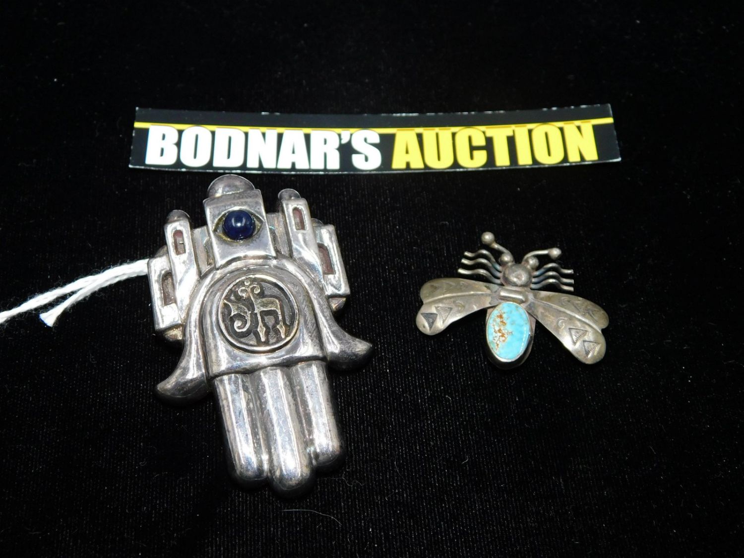 2 sterling silver pins including an Israel style pin/pendant with a dark stone marked Frank Meisler, Israel and a bee pin with turquoise. Measures approx. 1 1/4" – 2 1/2". All invoices must be paid within 24 hours of the sale. All items are shipped USPS or UPS and will be billed separately. A $12 handling fee is added to the shipping price per lot if shipped in house. Some items or large quantity of purchases will be packed and shipped via the UPS store. Local pickups are at our South Brunswick location on Friday, Saturday and Monday ONLY! All pickups are by appointment only. Any condition issues will be listed in the description. Please read the terms for full information.