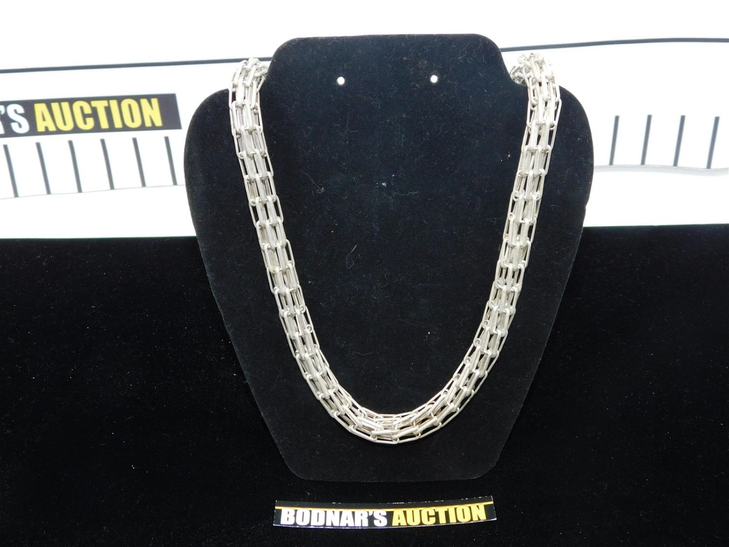 Oversized sterling silver link necklace with large links. Marked 925. Measures approx. 29 1/2". All invoices must be paid within 24 hours of the sale. All items are shipped USPS or UPS and will be billed separately. A $12 handling fee is added to the shipping price per lot if shipped in house. Some items or large quantity of purchases will be packed and shipped via the UPS store. Local pickups are at our South Brunswick location on Friday, Saturday and Monday ONLY! All pickups are by appointment only. Any condition issues will be listed in the description. Please read the terms for full information.