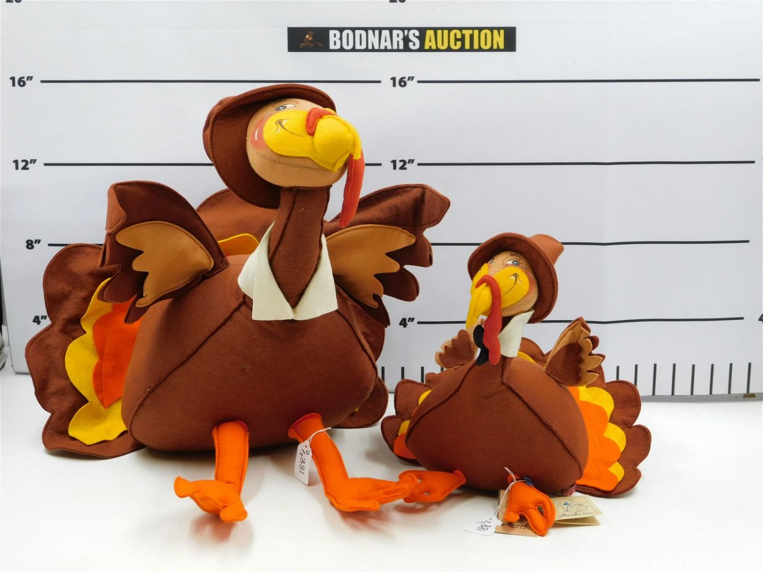 Lot of 2 Annalee Turkeys. Measures 17.5" and 13" tall. Please read the terms and conditions. This sale will be broadcast live on sale day with full descriptions of each lot being sold. All items MUST be paid for within 24 HOURS of the sale. Anyone who has not paid within 24 hours will have a dispute opened against them and will not be able to bid at future sales. If you need your items shipped, we are using Liveauctioneers Live Ship. They will pack it and ship it to you and it will be on your invoice at check out.. If you are picking your items up you must contact us NO LATER than 24 hours after the sale to schedule an appointment to pick up. Pick up dates are Thursday, Friday, Saturday, and Monday ONLY, and are BY APPOINTMENT ONLY!! After Monday, if you have not picked up your items, they will be disposed of.