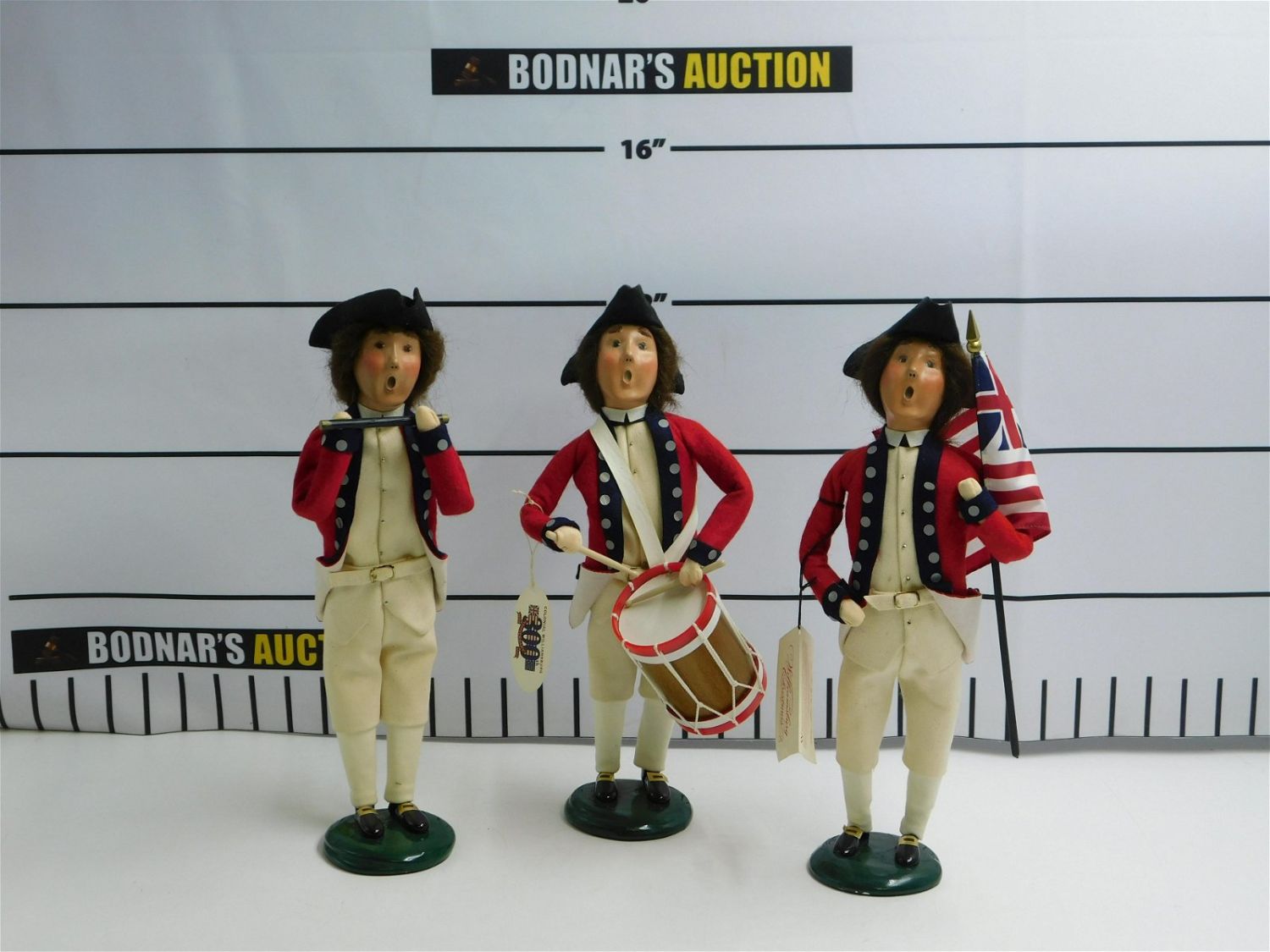 Lot of 3 Byers Choice Colonial Williamsburg Carolers. Includes Drummer, Flag Holder, and Drummer. They all measure approx. 13". Please read the terms and conditions. This sale will be broadcast live on sale day with full descriptions of each lot being sold. All items MUST be paid for within 24 HOURS of the sale. Anyone who has not paid within 24 hours will have a dispute opened against them and will not be able to bid at future sales. If you need your items shipped, we are using Liveauctioneers Live Ship. They will pack it and ship it to you and it will be on your invoice at check out.. If you are picking your items up you must contact us NO LATER than 24 hours after the sale to schedule an appointment to pick up. Pick up dates are Thursday, Friday, Saturday, and Monday ONLY, and are BY APPOINTMENT ONLY!! After Monday, if you have not picked up your items, they will be disposed of.