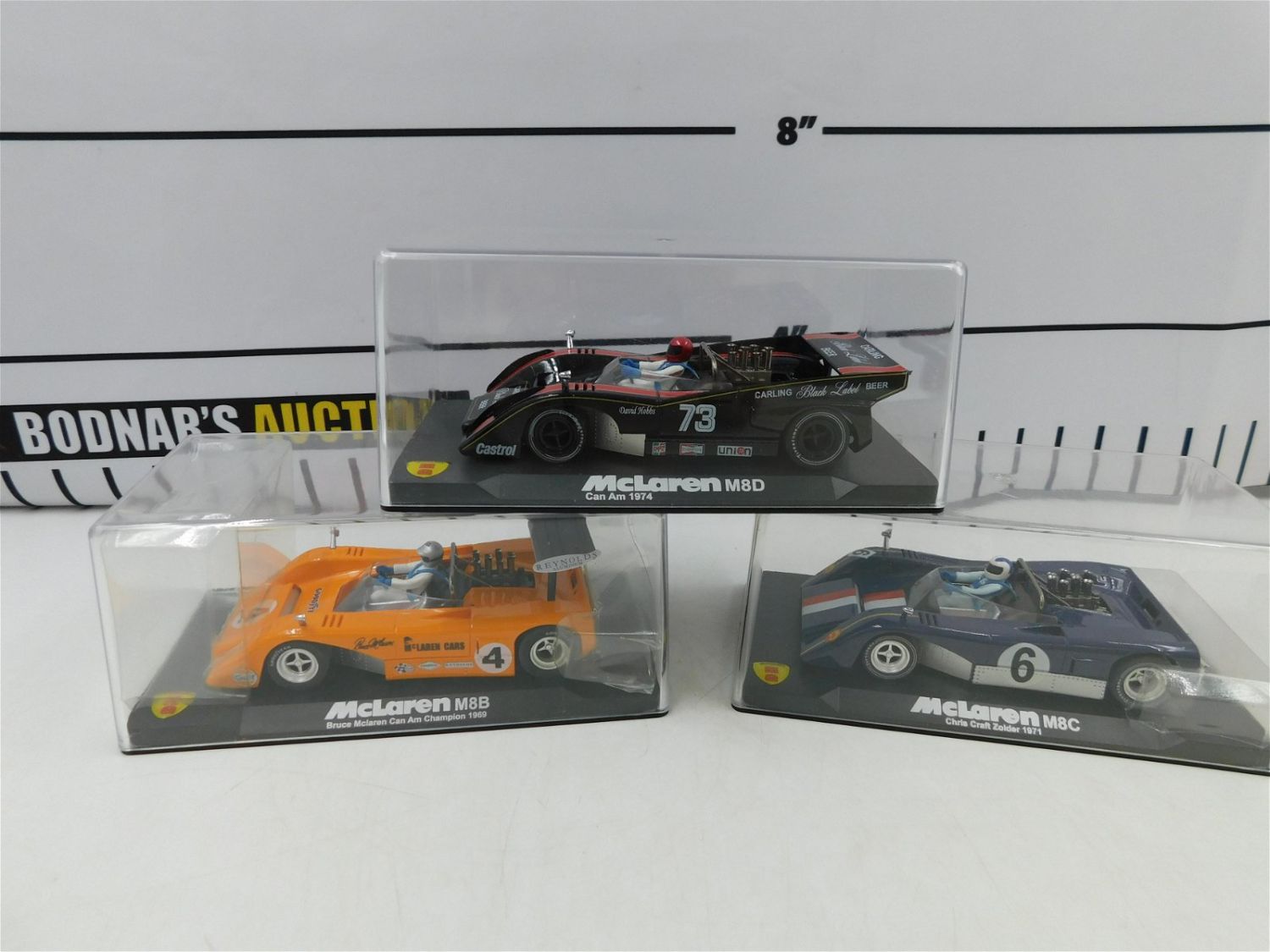 Lot of 3 Vanquish Slot Cars 1:32 Scale. Includes McLaren M8B Bruce McLaren Can Am Champion 1969, McLaren M8C Chris Craft Zolder 1971, and McLaren M8D Can Am 1974. All slot cars are in new or carefully displayed condition. Please read the terms and conditions. This sale will be broadcast live on sale day with full descriptions of each lot being sold. All items MUST be paid for within 24 HOURS of the sale. Anyone who has not paid within 24 hours will have a dispute opened against them and will not be able to bid at future sales. If you need your items shipped, we are using Liveauctioneers Live Ship. They will pack it and ship it to you and it will be on your invoice at check out.. If you are picking your items up you must contact us NO LATER than 24 hours after the sale to schedule an appointment to pick up. Pick up dates are Thursday, Friday, Saturday, and Monday ONLY, and are BY APPOINTMENT ONLY!! After Monday, if you have not picked up your items, they will be disposed of.
