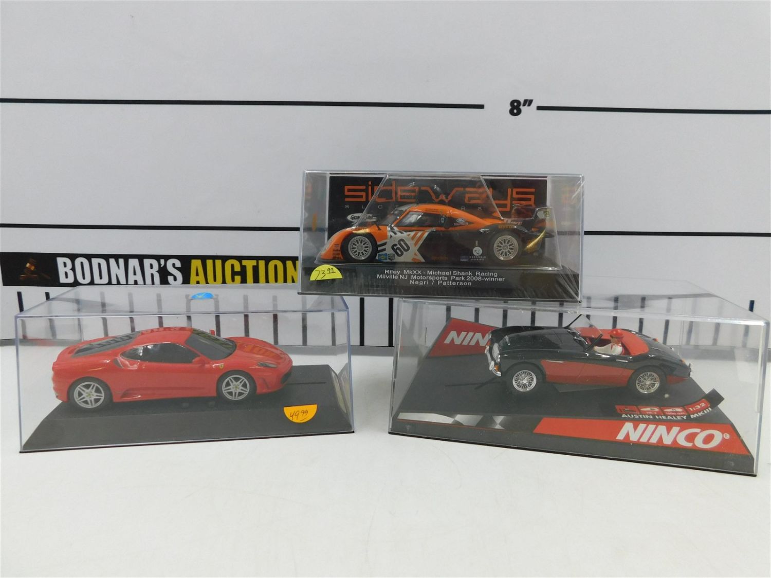 Lot of 3 Slot Cars 1:32 Scale. Includes Ninco Austin Healey MKIII, Scalextric Ferrari F430, Slot.it Riley MkXX – Michael Shank Racing Milville NJ Motorsports Park 2008 Winner Negril/Patterson. All slot cars are in new or carefully displayed condition. Please read the terms and conditions. This sale will be broadcast live on sale day with full descriptions of each lot being sold. All items MUST be paid for within 24 HOURS of the sale. Anyone who has not paid within 24 hours will have a dispute opened against them and will not be able to bid at future sales. If you need your items shipped, we are using Liveauctioneers Live Ship. They will pack it and ship it to you and it will be on your invoice at check out.. If you are picking your items up you must contact us NO LATER than 24 hours after the sale to schedule an appointment to pick up. Pick up dates are Thursday, Friday, Saturday, and Monday ONLY, and are BY APPOINTMENT ONLY!! After Monday, if you have not picked up your items, they will be disposed of.