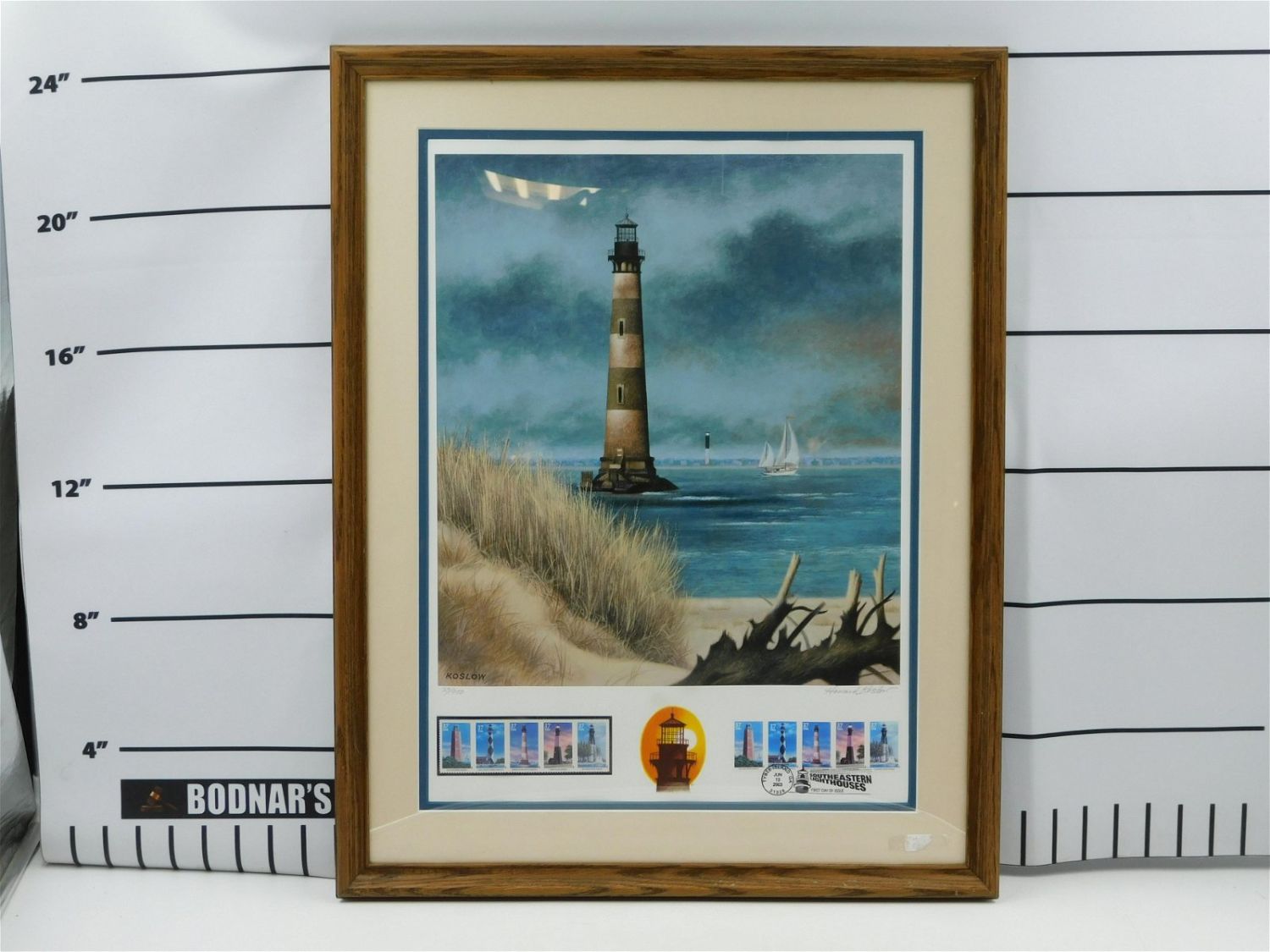 Morris Island print by Howard Koslow framed with the Southeastern Lighthouses which includes 10 stamps of various lighthouses. Signed and numbered 23 out of 950. Print is framed in wood and plexiglass. Frame measures approx. 25" tall x 19 1/2" wide. All invoices must be paid within 24 hours of the sale. All items are shipped USPS or UPS and will be billed separately. A $12 handling fee is added to the shipping price per lot if shipped in house. Some items or large quantity of purchases will be packed and shipped via the UPS store. Local pickups are at our South Brunswick location on Friday, Saturday and Monday ONLY! All pickups are by appointment only. Any condition issues will be listed in the description. Please read the terms for full information.
